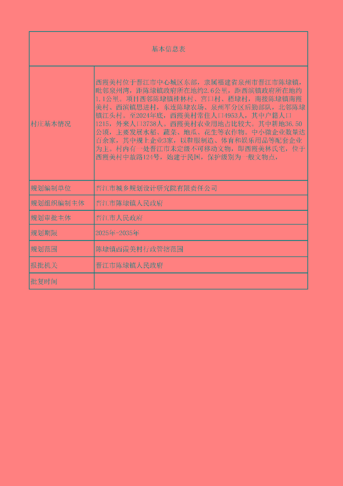项目名称:《晋江市陈埭镇西霞美村村庄规划(2025—2035年)》