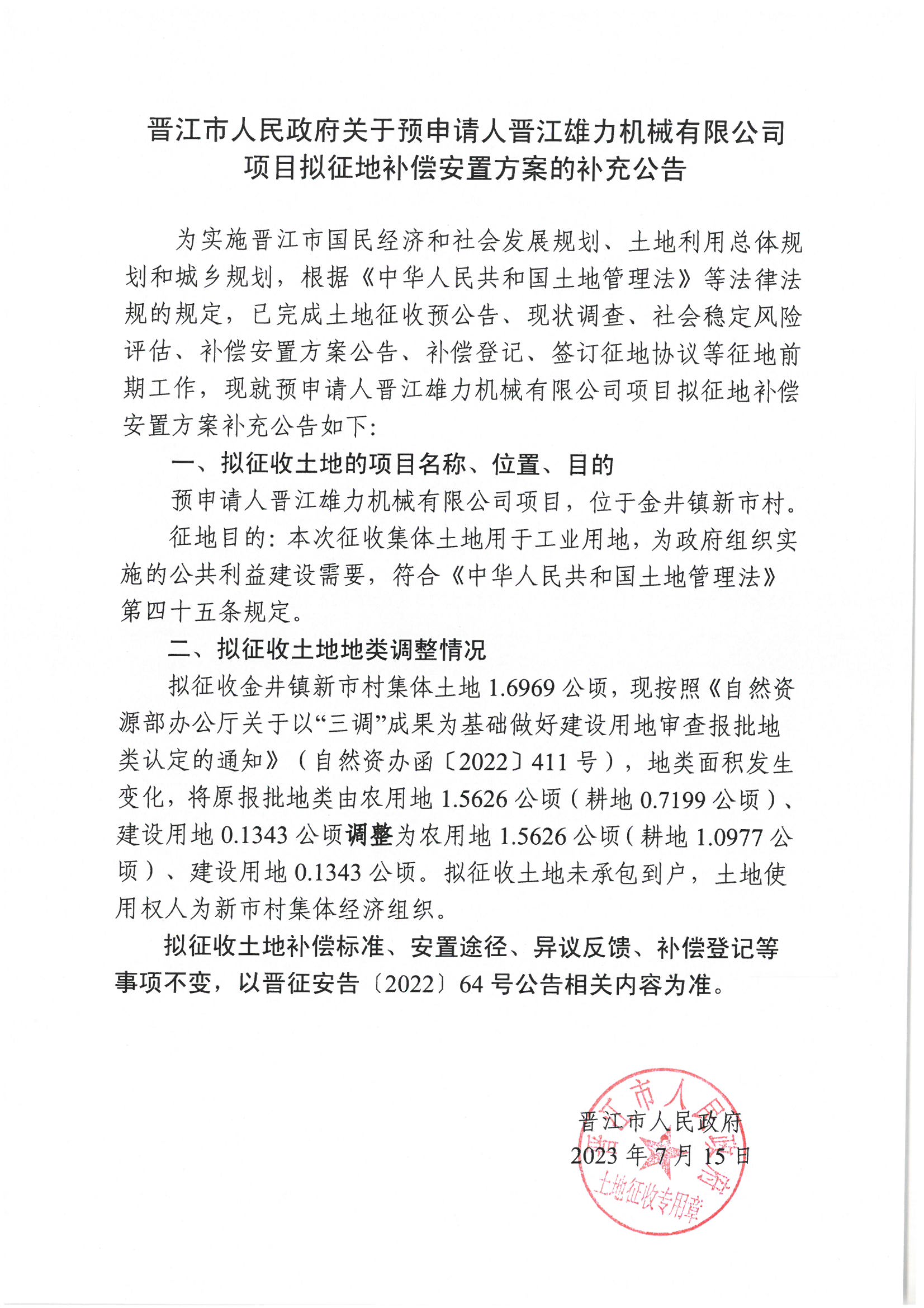 晋江市人民政府关于预申请人晋江雄力机械有限公司项目拟征地补偿安置方案的补充公告