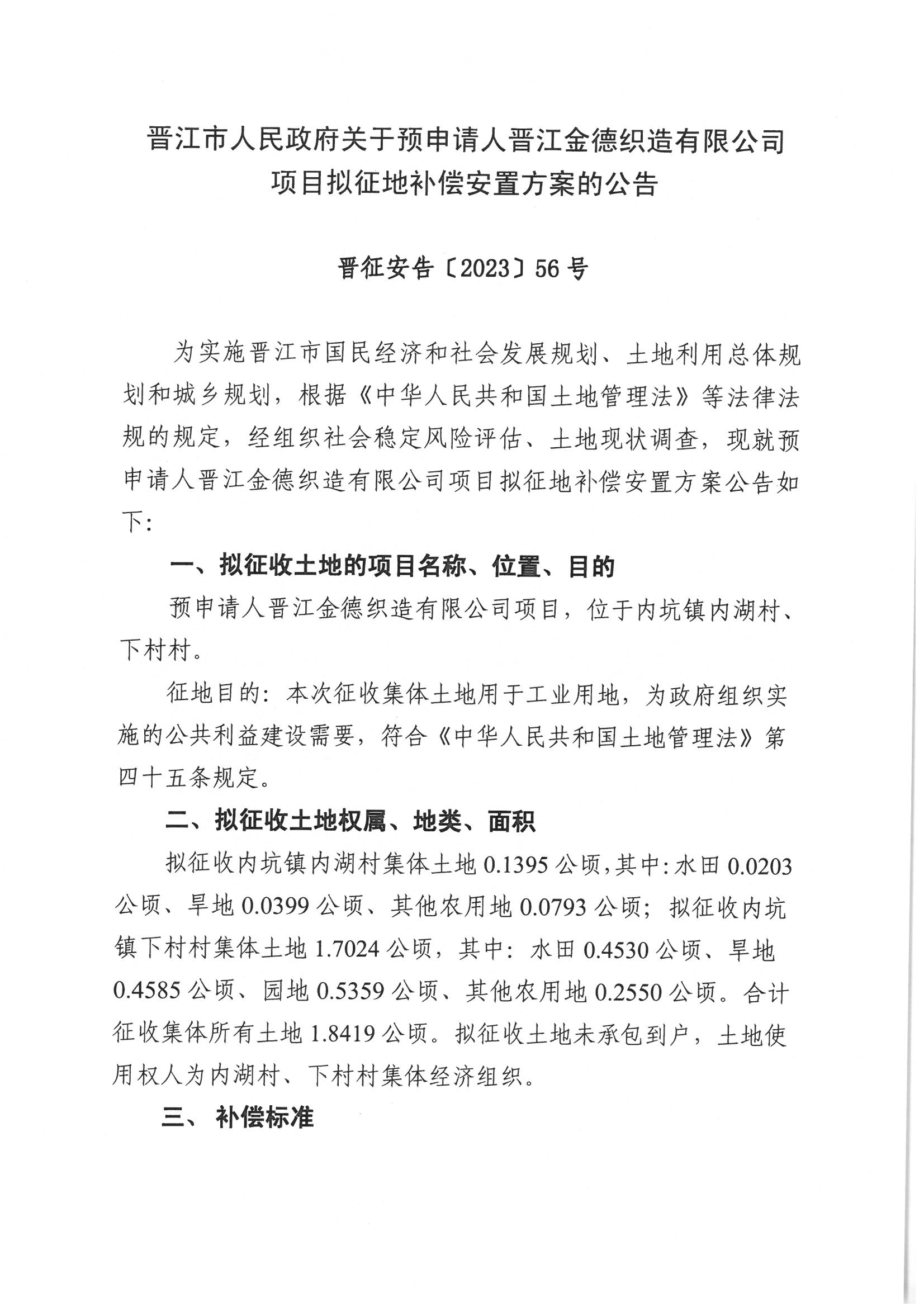 晋江市人民政府关于预申请人晋江金德织造有限公司项目拟征地补偿安置方案的公告