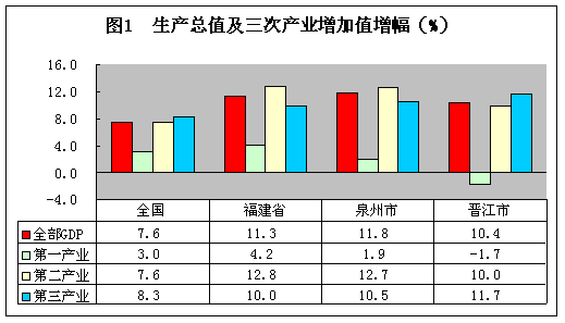 从三次产业占比看,全国为7.5:47.2:45.3,全省为7.3:56.0:36.7,泉州市为2.7∶64.2∶33.1,晋江市为0.9:70.6:28.5。晋江市第三产业增加值占GDP的比重分别低于全国、全省、泉州市16.8、8.2、4.6个百分点。比较结果表明,虽然今年来我市第三产业保持较快发展,但三产占GDP比重偏低的现状仍未改变。