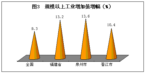 晋江市规模以上工业增加值增长10.4%,高于全国1.1个百分点,分别低于全省、泉州市2.8、3.2个百分点。在泉州市13个县(市、区)中,增幅列居第13位。
