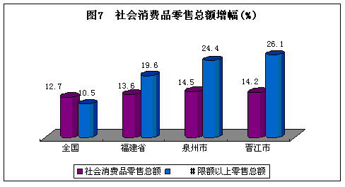 晋江市社会消费品零售总额增长14.2%,分别高于全国、全省1.5、0.6个百分点,但低于泉州市0.3个百分点;在泉州市13个县(市、区)中,增幅列居第5位;晋江市限额以上零售额增长26.1%,分别高于全国、全省、泉州市15.6、6.5、1.7个百分点;在泉州市13个县(市、区)中,增幅列居第6位。可见,晋江市消费需求保持较快增长,对经济增长的拉动作用进一步增强。