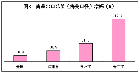 晋江市商品自营出口(海关口径)增长73.2%,增幅分别高于全国、全省、泉州市62.8、54.7、42.2个百分点;在泉州市13个县(市、区、开发区)中,增幅列居第1位。在欧债危机仍未解除、外部需求显著下降的情况下,晋江市自营出口仍能维持高位增长态势实属不易,当归功于出口产品结构的不断优化、出口市场的拓展延伸以及政策扶持所取得的成效。