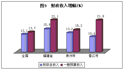 晋江市财政总收入增长10.4%,分别低于全国、全省、泉州市1.7、5.4、2.8个百分点;在泉州市13个县(市、区)中,增幅列居第9位。其中,一般预算收入增长21.9%,分别高于全国、泉州市8.2、6.7个百分点,但低于全省0.2个百分点。由于经济不景气,企业经营效益下降,增值税和所得税增幅回落较快,财政收入增速明显放缓。
