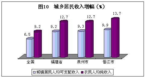 晋江市城镇居民人均可支配收入增长9.9%,分别高于全国、全省、泉州市3.4、0.7、0.6个百分点。在泉州市9个县(市、区)中,增幅并列第1位。农民人均纯收入增长13.7%,分别高于全国、全省、泉州市4.5、1.0、1.0个百分点。在泉州市9个县(市、区)中,增幅列居第2位。