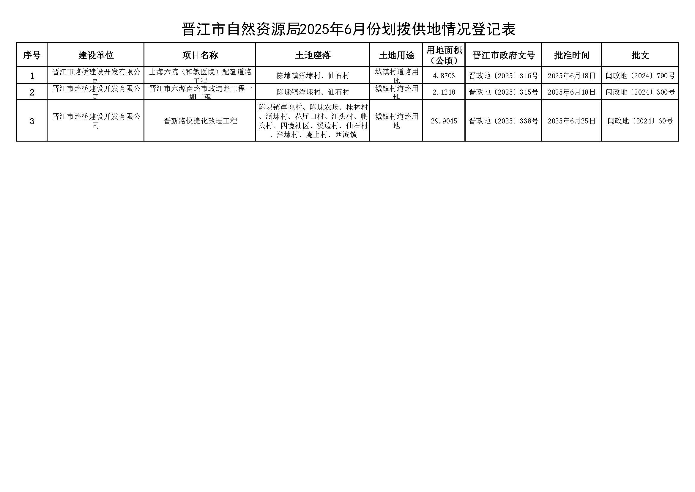 晋江市自然资源局2025年6月份划拨供地情况登记表