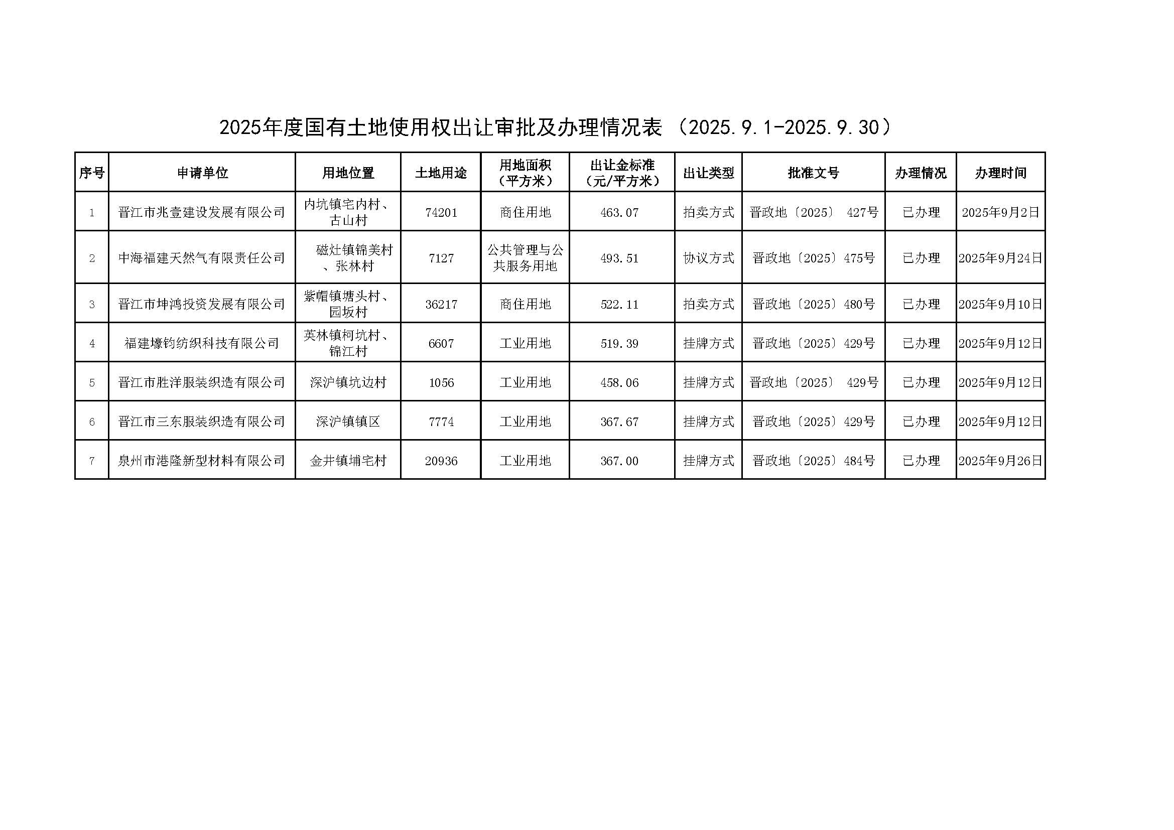 2025年度国有土地使用权出让审批及办理情况表(2025.9.1-2025.9.30)