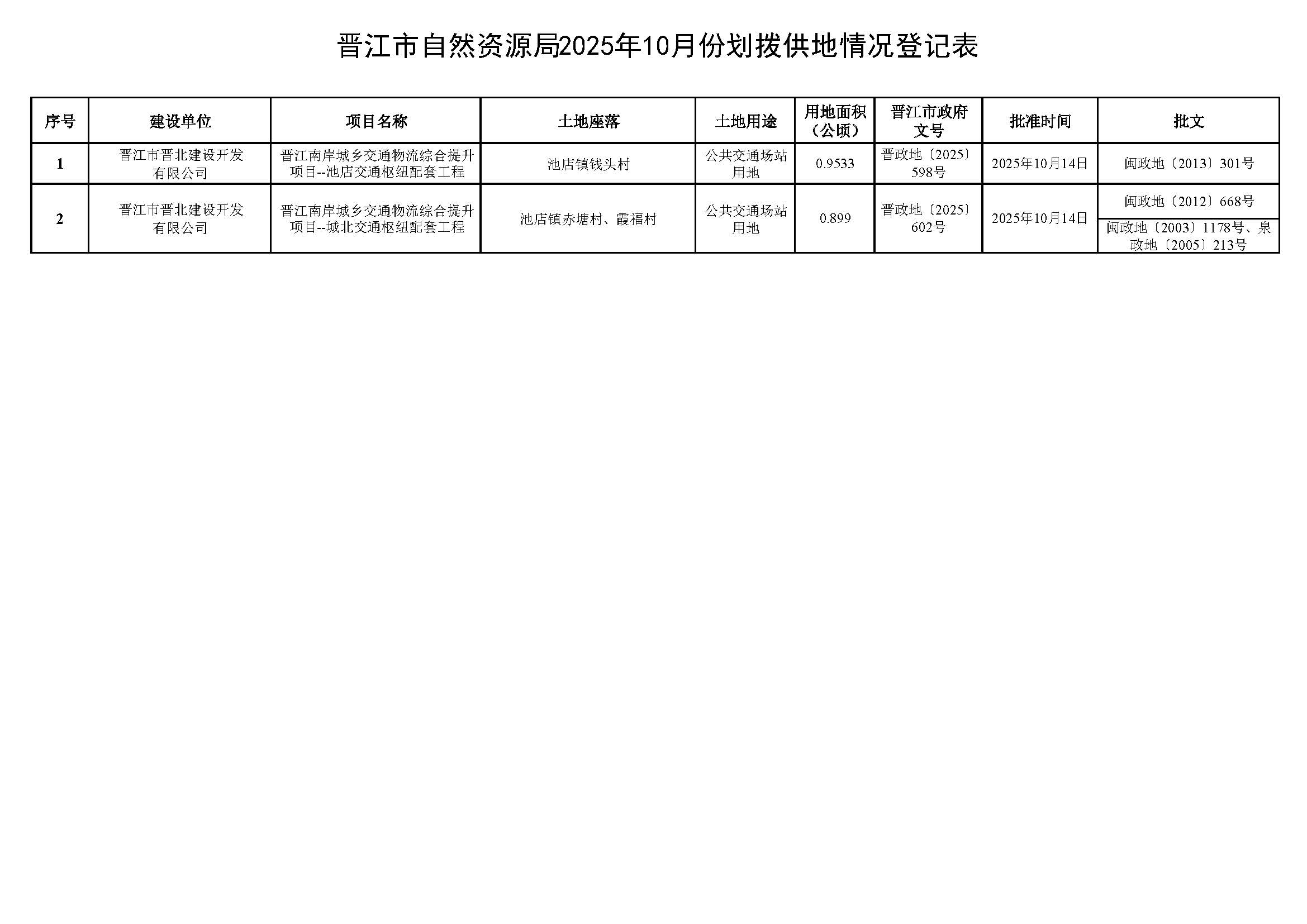 晋江市自然资源局2025年10月份划拨供地情况登记表