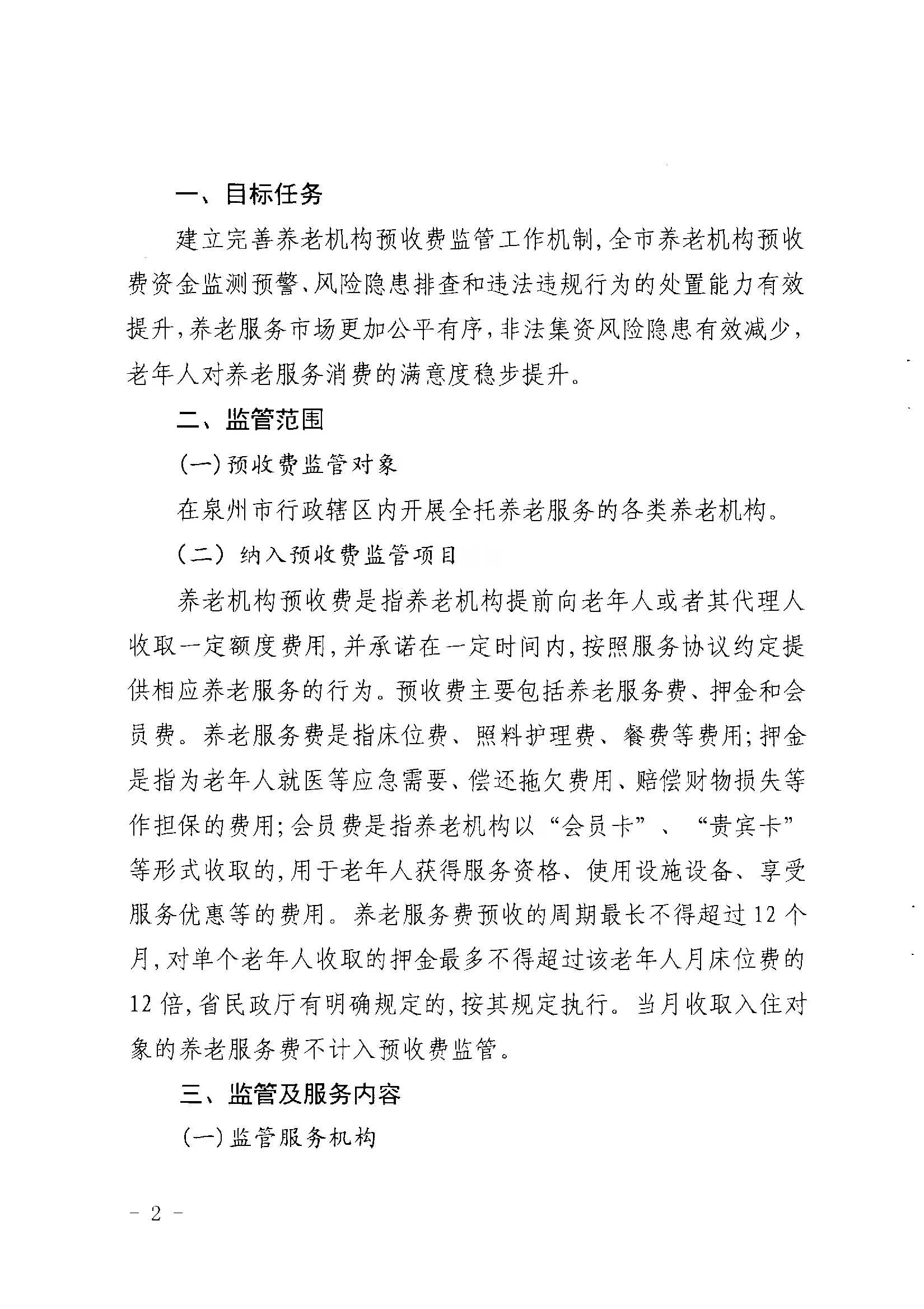 为防范非法集资等金融风险,规范养老机构预收费行为,保障老年人合法权益,推动养老服务高质量发展。现将《泉州市民政局关于开展养老机构预收费监管服务有关工作的通知》(泉民养老〔2025〕18号)转发给你们,并做以下强调,请遵照执行。