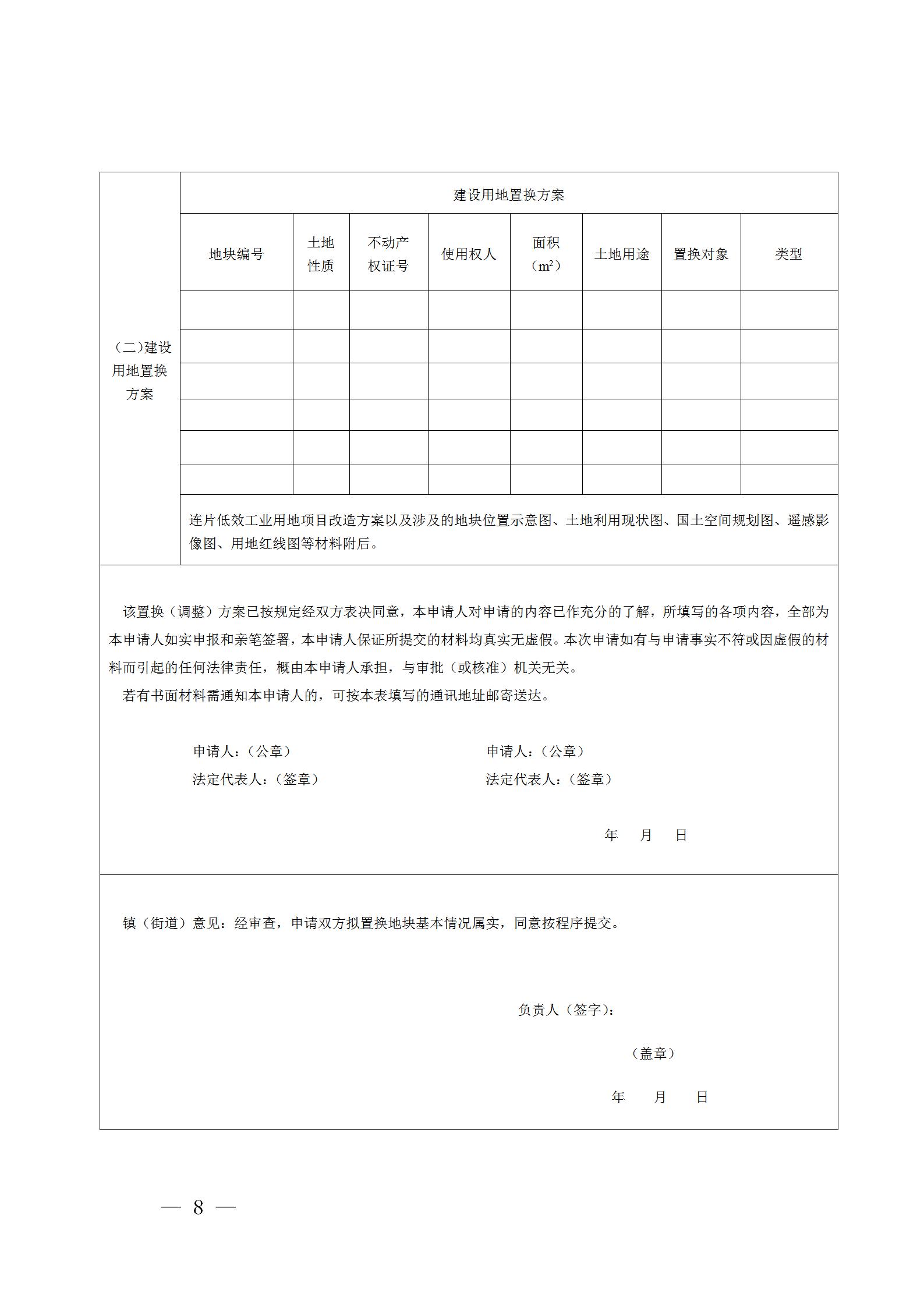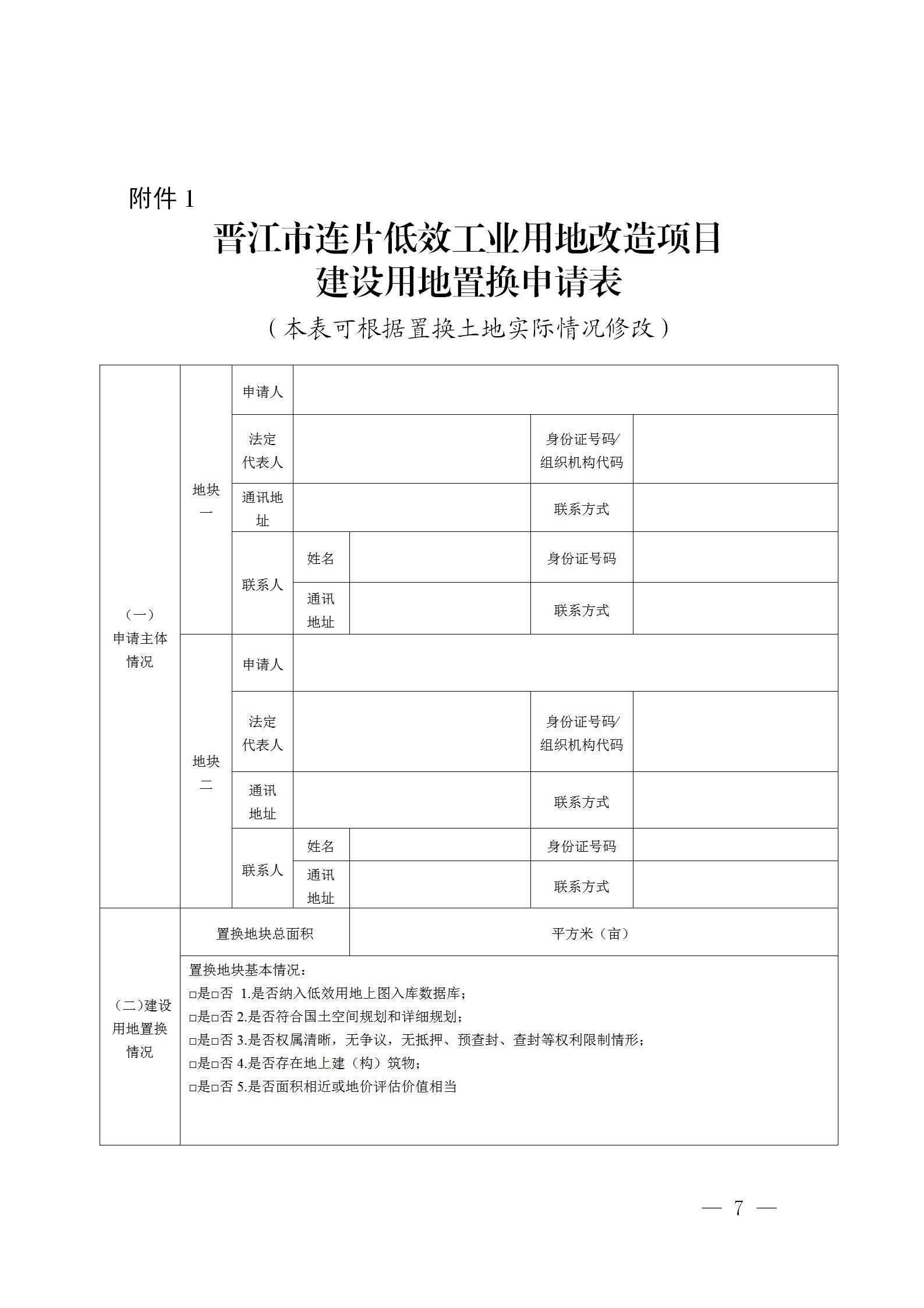 (一)晋江市连片低效工业用地改造项目建设用地置换申请表(附件1),连片低效工业用地项目建设用地置换方案(附件2)以及置换方案涉及地块的位置示意图、土地利用现状图、国土空间规划图、遥感影像图、用地红线图等材料作为申请表附件附后,并加盖申请单位骑缝章;