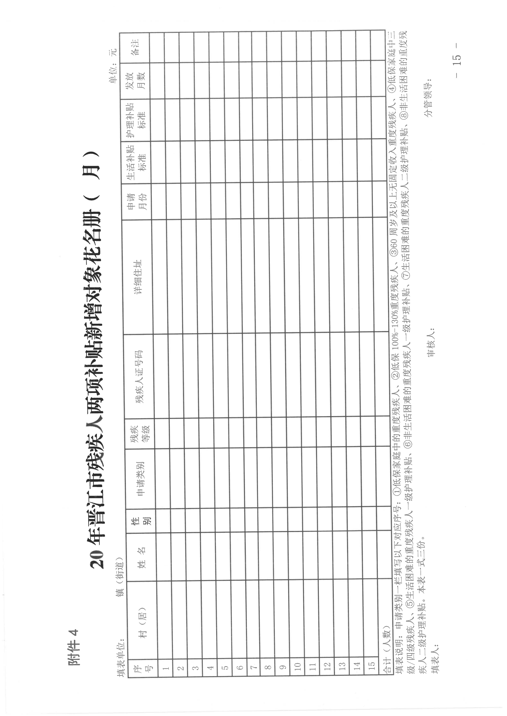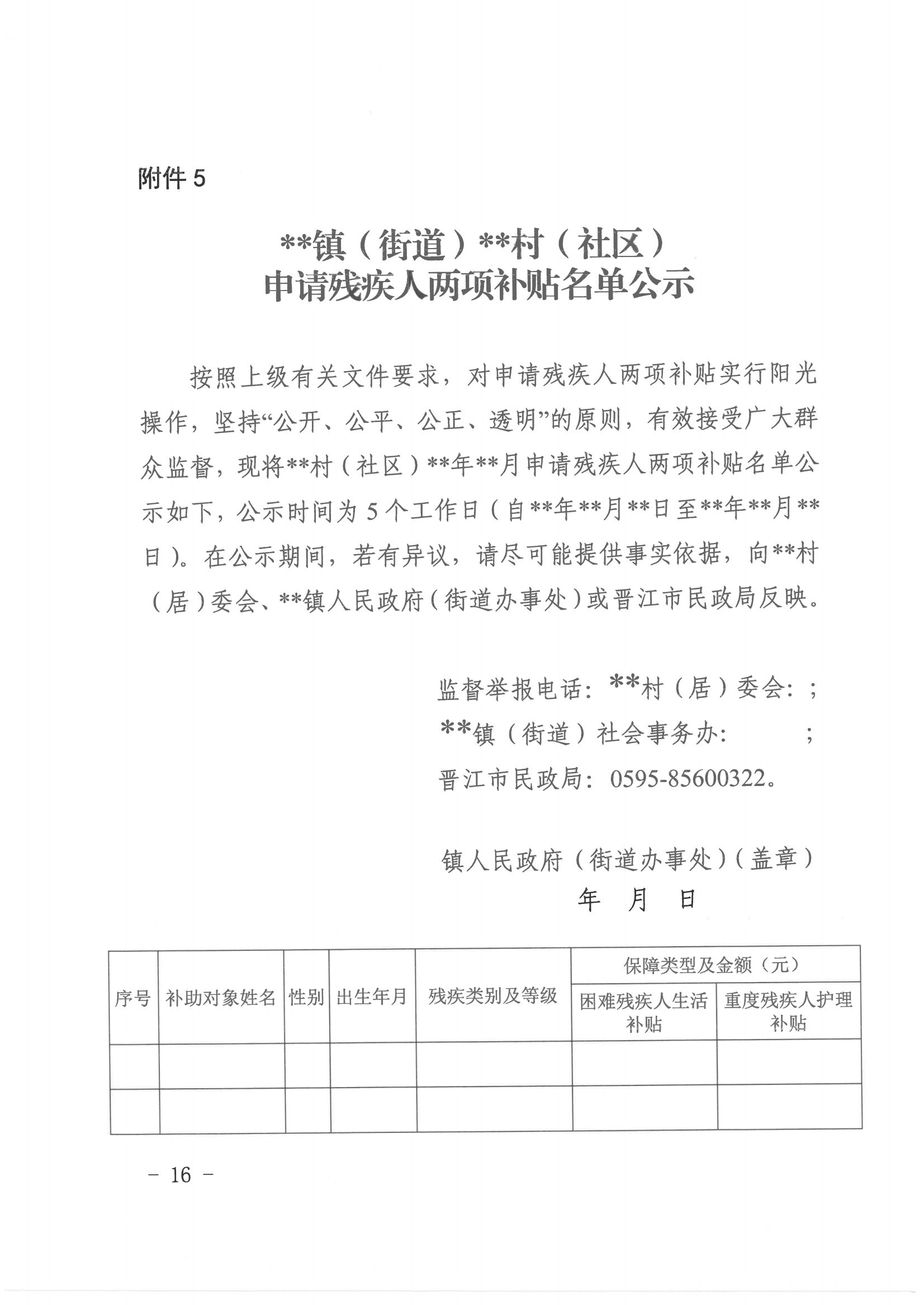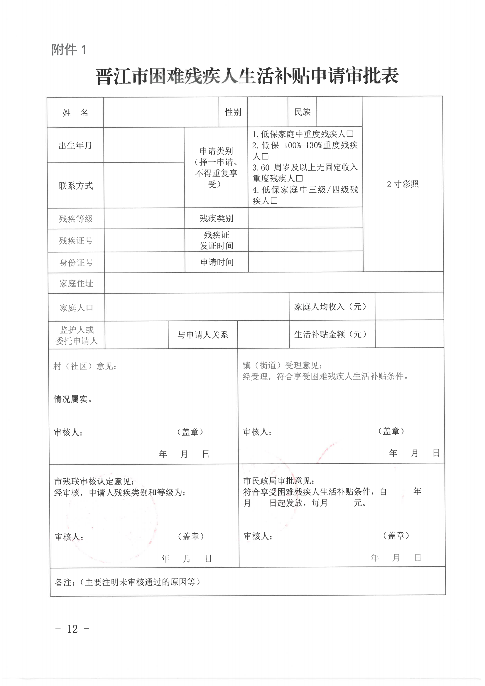 附件:1.晋江市困难残疾人生活补贴申请审批表