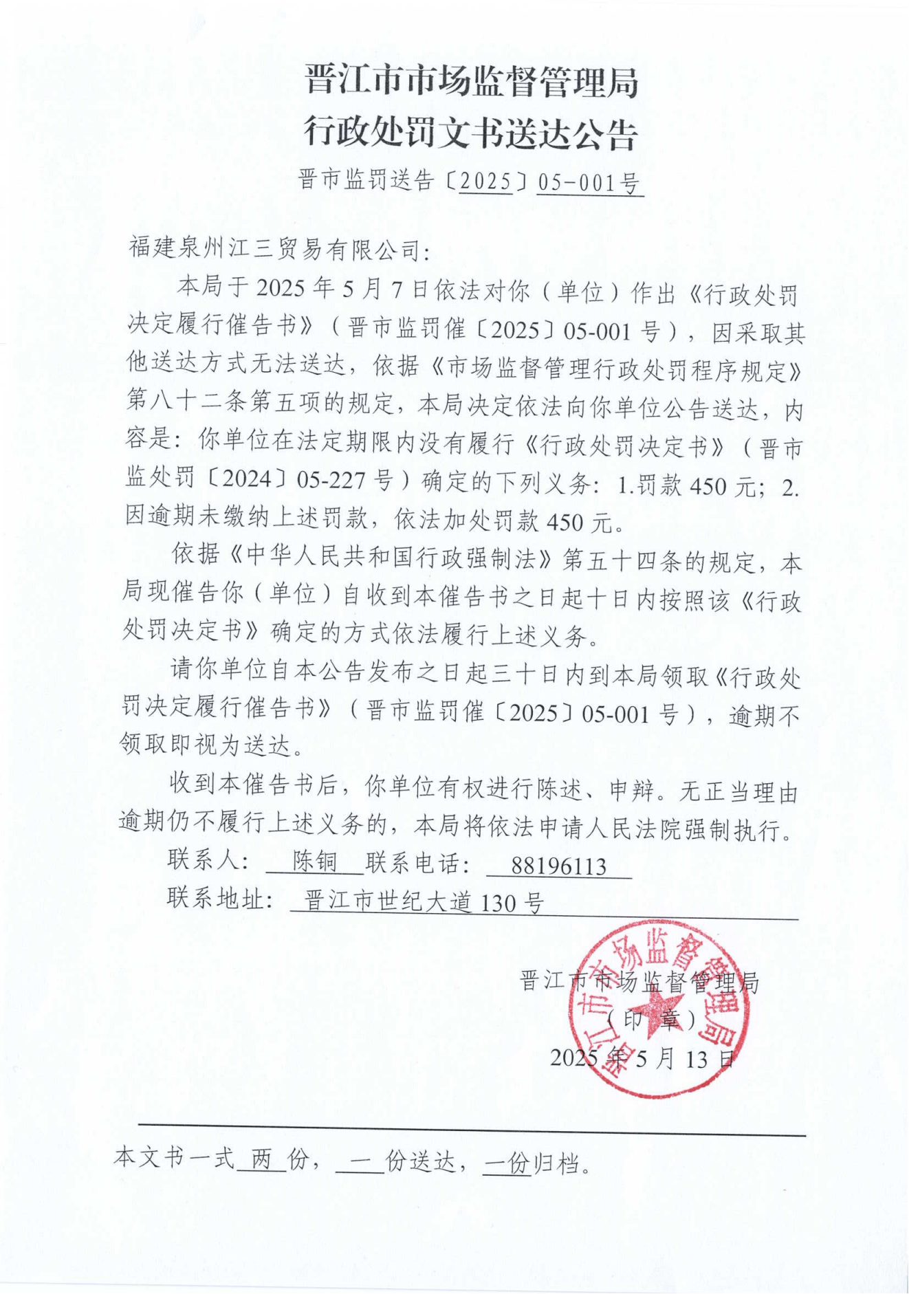 晋江市市场监督管理局行政处罚决定履行催告书送达公告(福建泉州江三贸易有限公司)