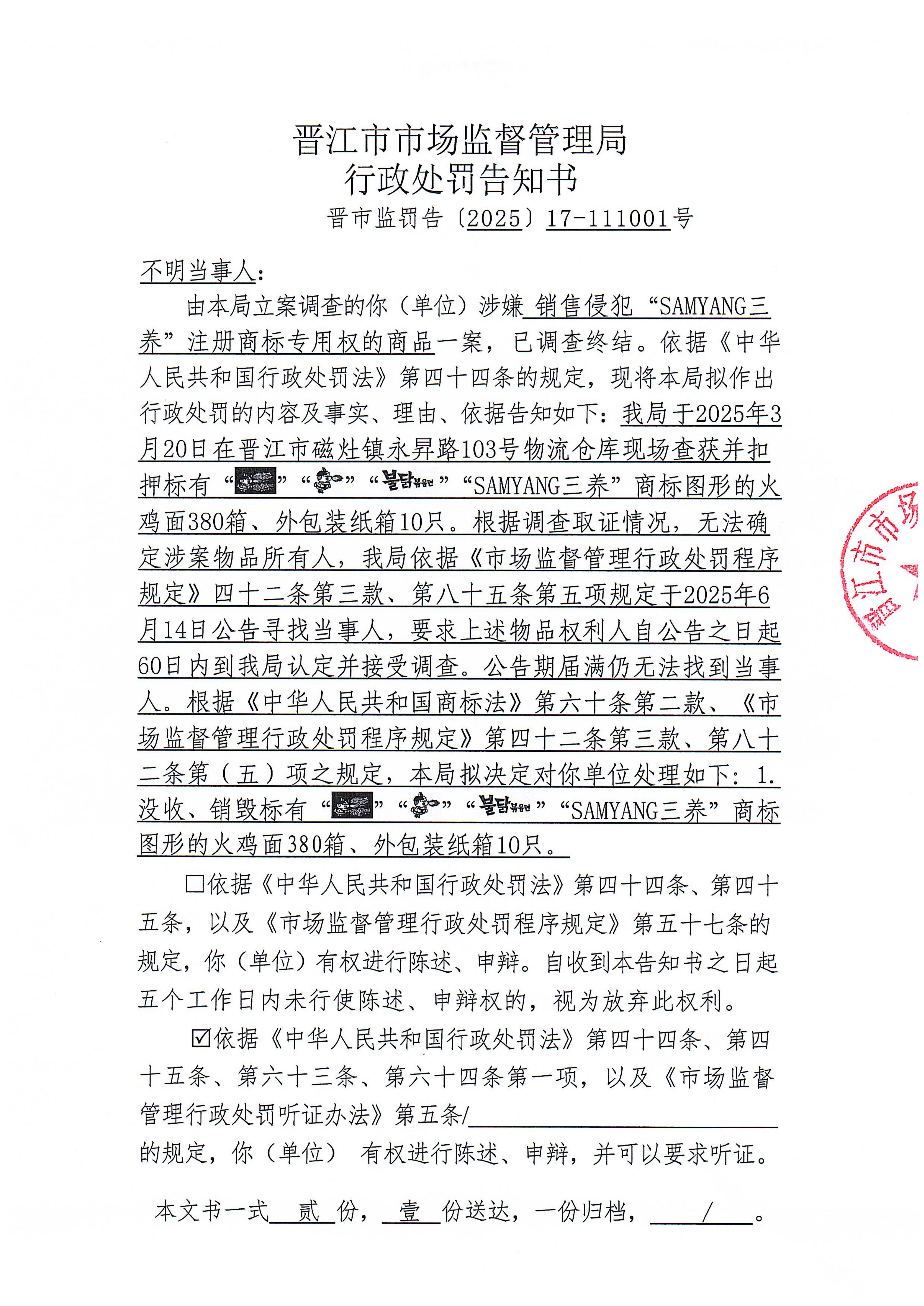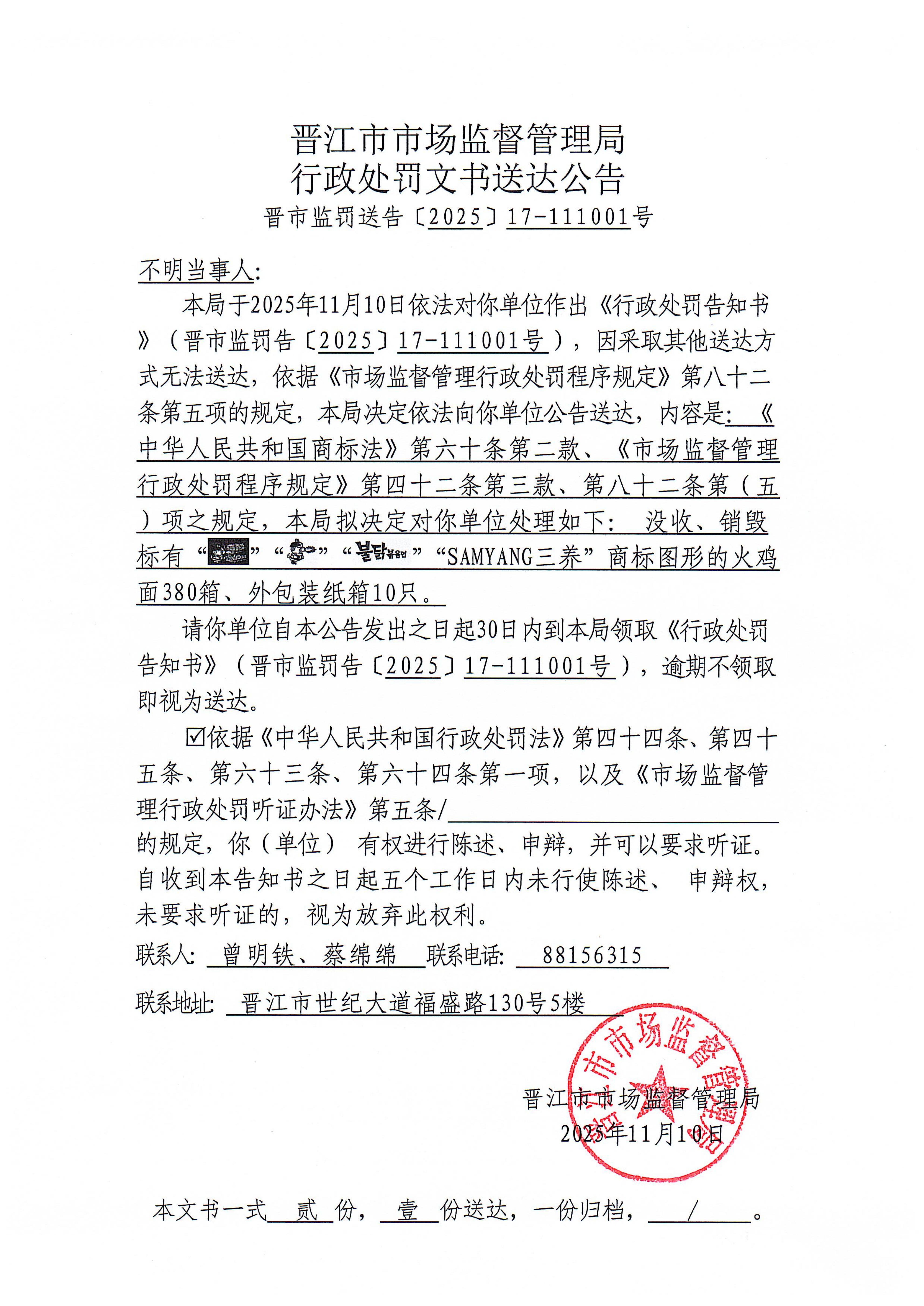 晋江市市场监督管理局行政处罚文书送达公告(晋市监罚送告〔2025〕17-111001号 不明当事人)
