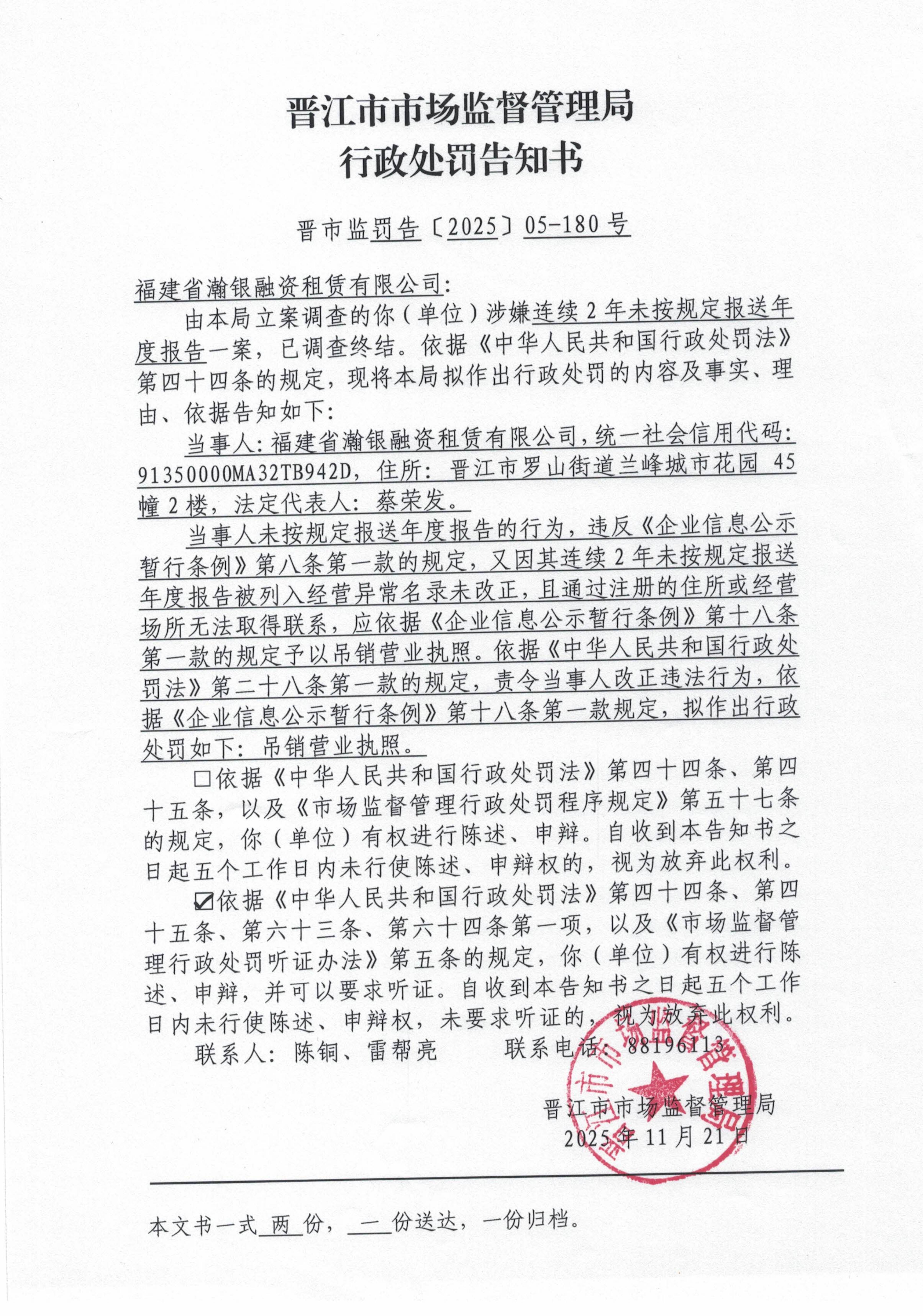 晋江市市场监督管理局行政处罚文书送达公告(晋市监罚送告[2025]05-003号 福建省瀚银融资租赁有限公司)