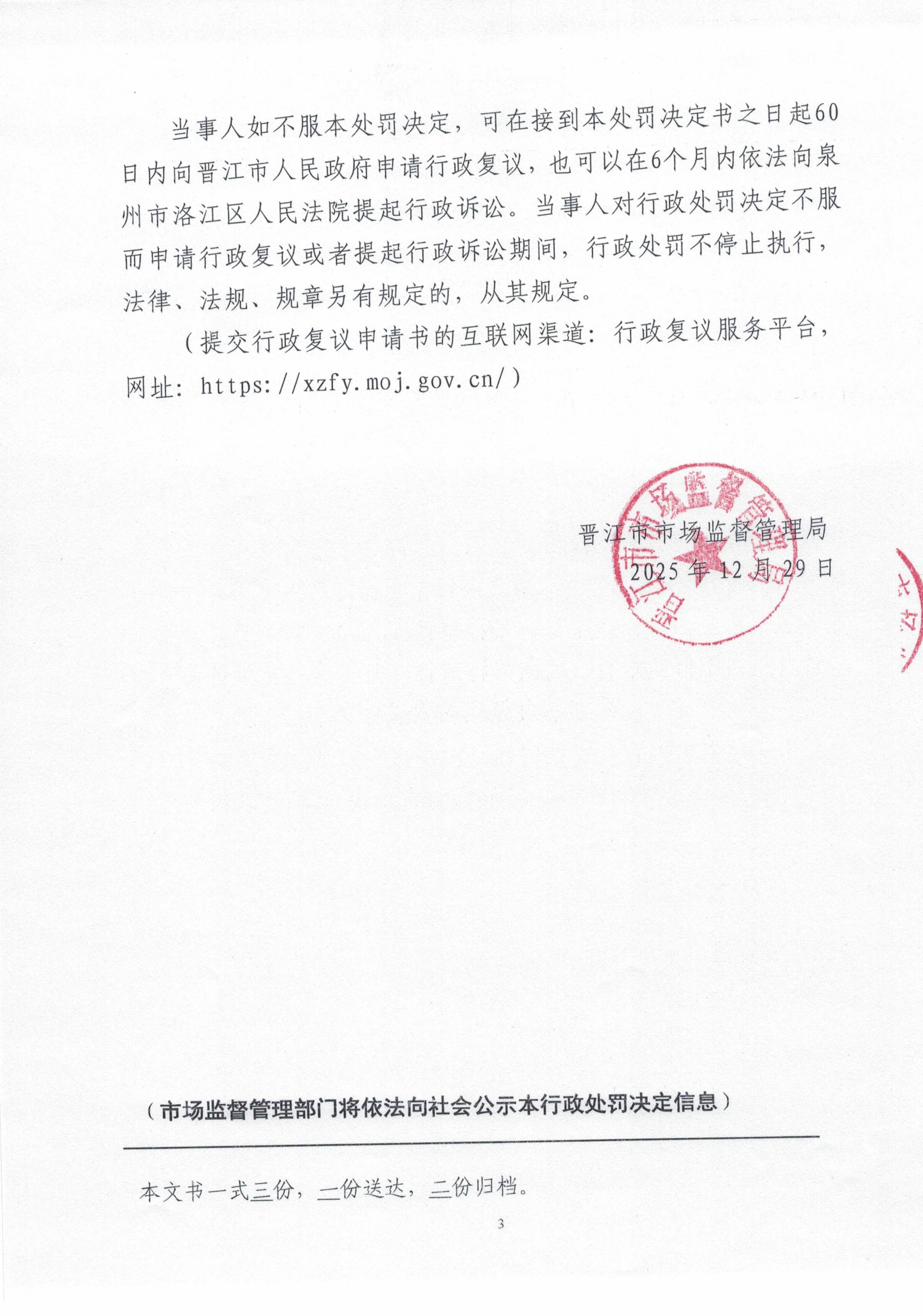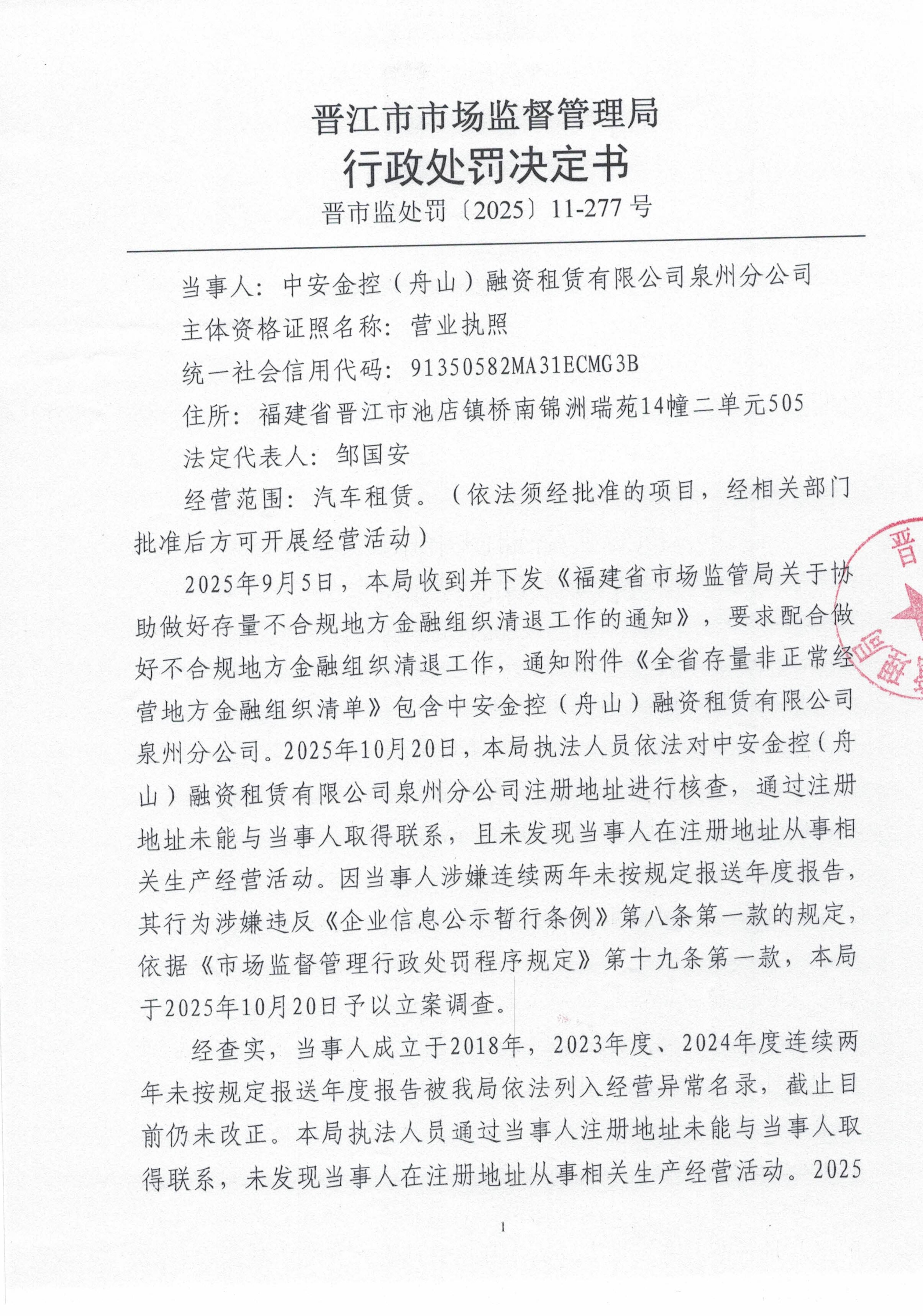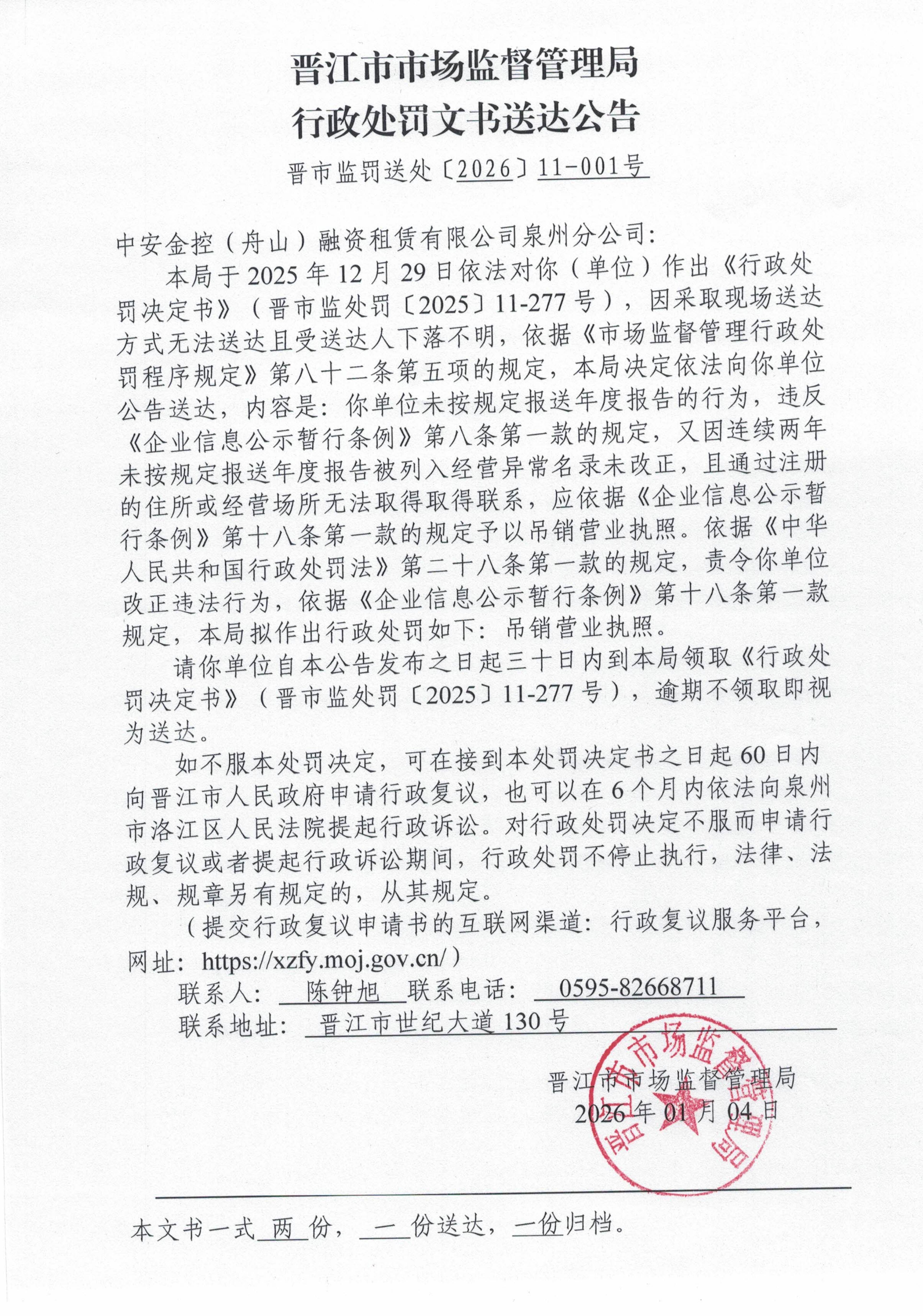 晋江市市场监督管理局行政处罚文书送达公告(中安金控(舟山)融资租赁有限公司泉州分公司 晋市监罚送处〔2026〕11-001号)
