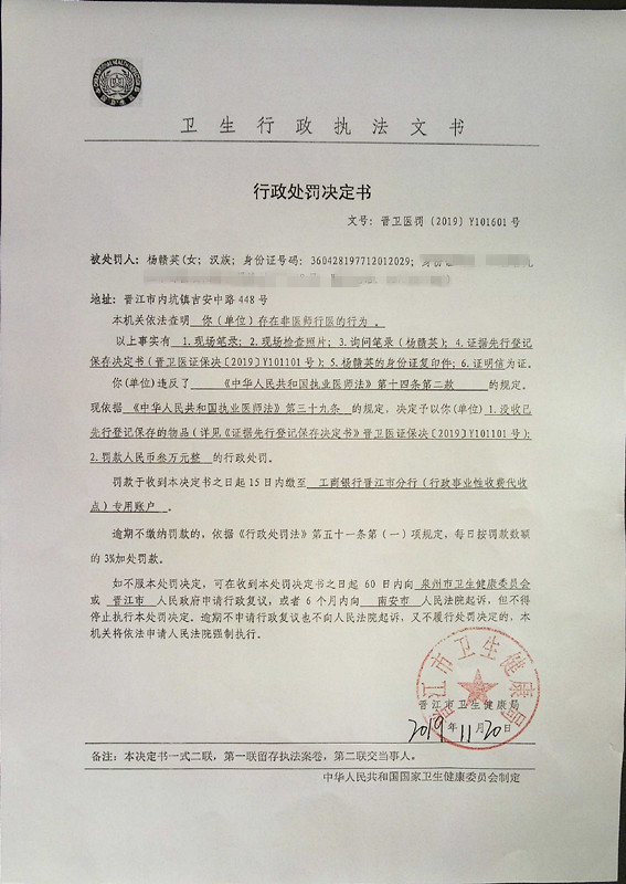 因无法用其它方式送达《行政处罚决定书》(晋卫医罚〔2019〕Y101601号),现向你公告送达(限你自本公告发出之日起60日内到我局领取,逾期则视为送达)。罚款于收到本决定书之日起15日内缴至工商银行晋江市分行国库帐户(先到我局开具《晋江市行政处罚缴款通知书》后到指定的工商银行网点缴交)。