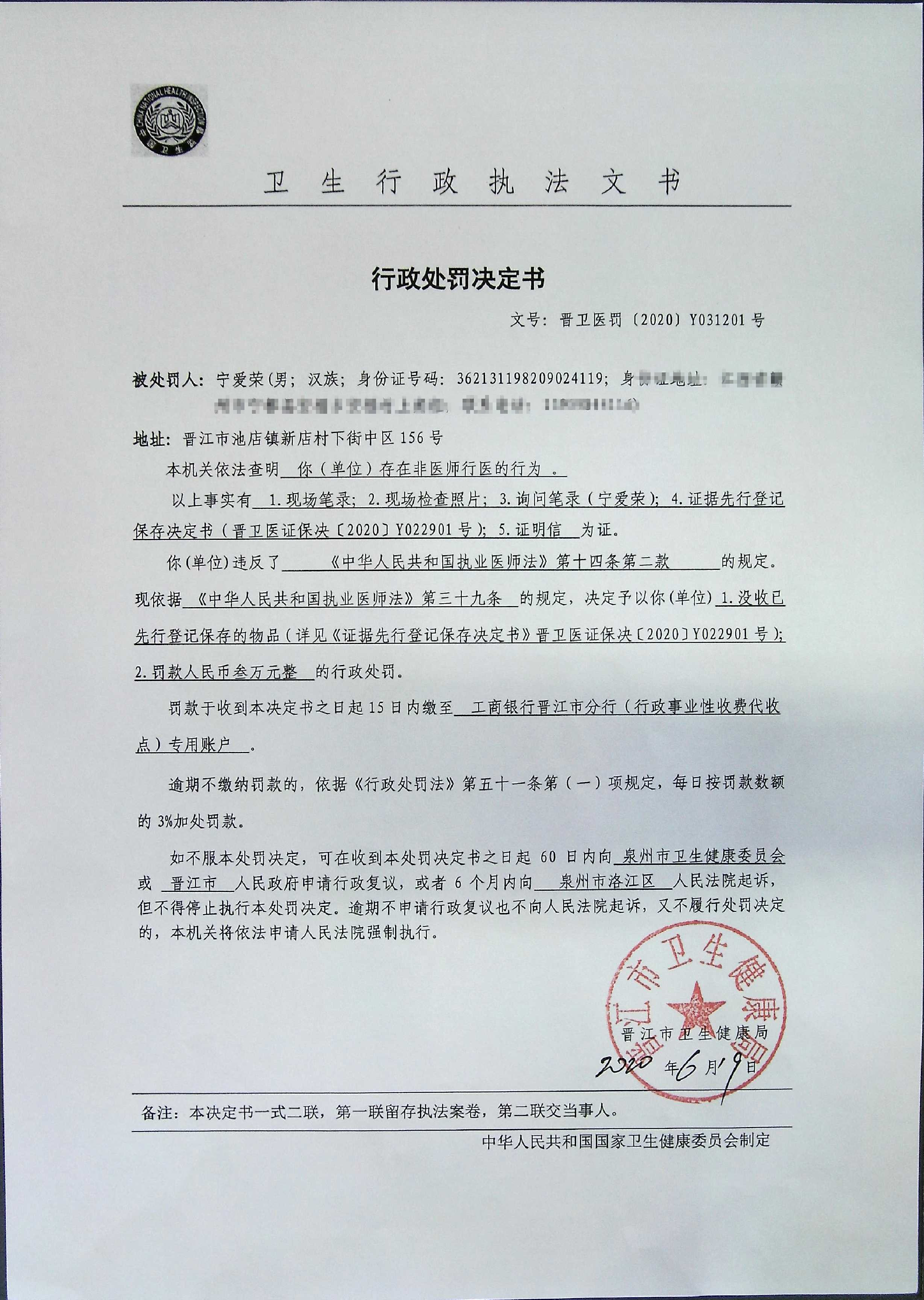 你非医师行医的行为已违反了《中华人民共和国执业医师法》第十四条第二款的规定,依据《中华人民共和国执业医师法》第三十九条规定, 我局按照卫生行政处罚程序于2020年6月19日依法对你作出: 1.没收已先行登记保存的物品(详见《证据先行登记保存决定书》晋卫医证保决〔2020〕Y022901号);2.罚款人民币叁万元整的行政处罚决定。