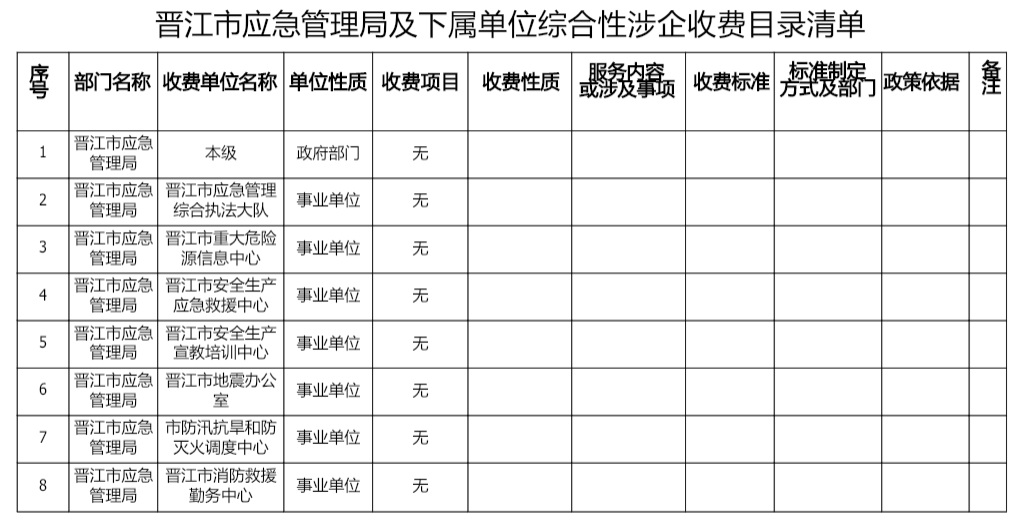 晋江市应急管理局及下属单位综合性涉企收费目录清单