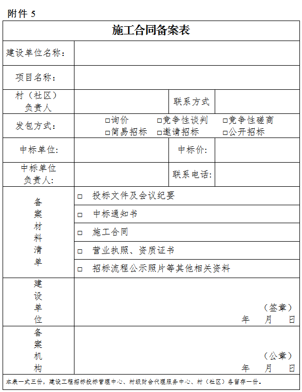 项目完成申请(备案)后,村(社区)应按照确定的招标方式确定施工方,并在福建省基层小微权力监督平台、村务公开栏公开公示(附件4),公示时间不少于3日。公示无异议的,村(社区)与中标人应当在5个工作日内签订合同,办理履约手续。单项工程预算审核在30万元以下的项目,村(社区)还应报镇村级建设工程招投标中心进行合同备案(附件5)。
