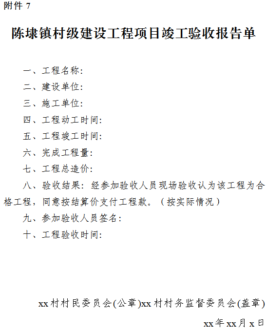 村级建设工程项目完工后,村集体应及时组织村(社区)“两委”成员、驻村干部、施工单位负责人、设计单位、监理单位、地质勘察等参建单位进行竣工验收,填写《陈埭镇村级建设工程项目竣工验收报告单》(附件7)。