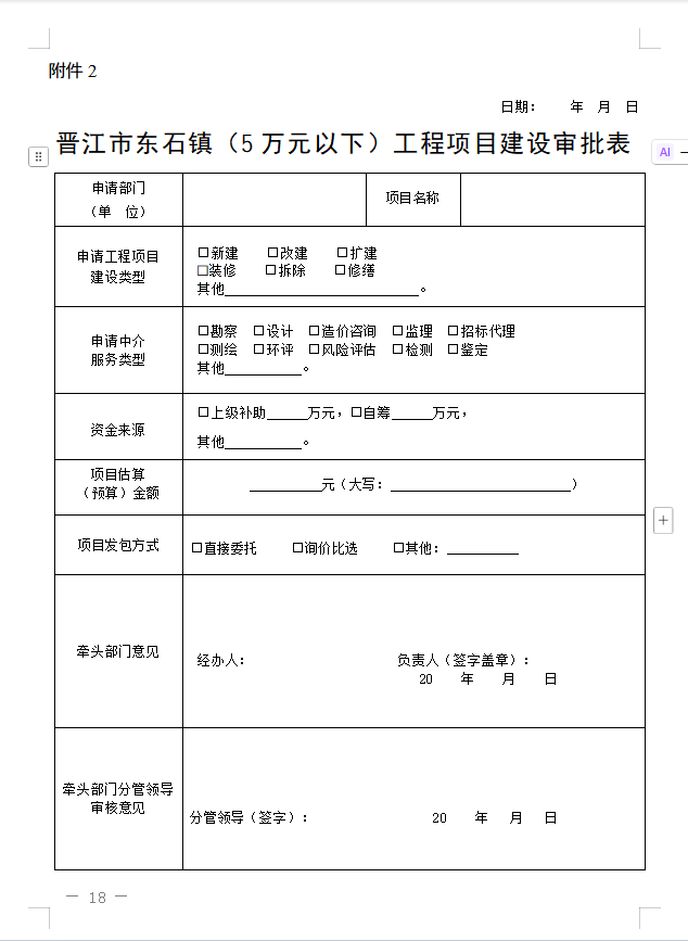 2.晋江市东石镇(5万元以下)工程项目建设审批表