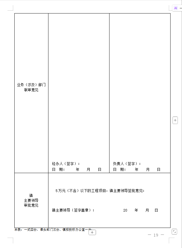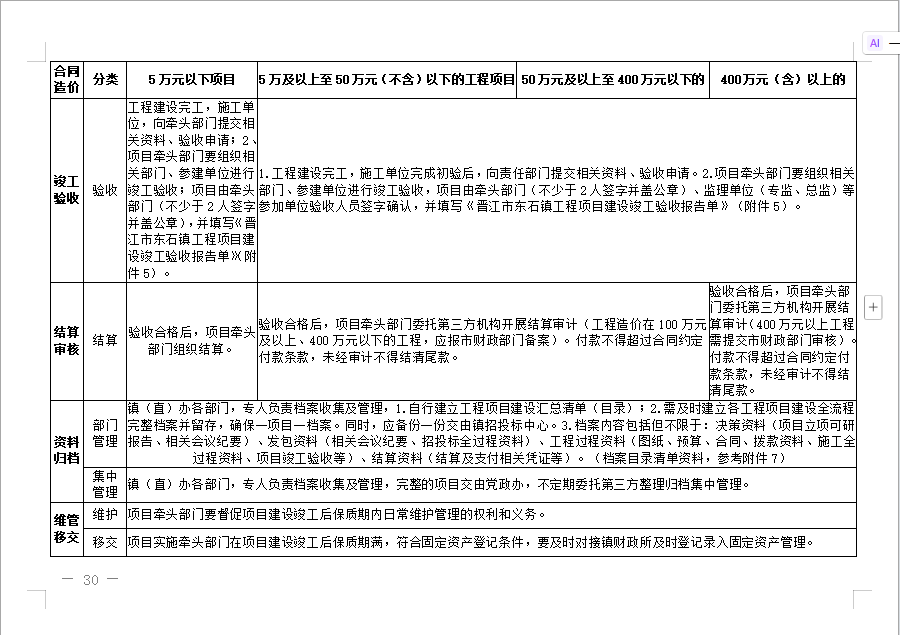(1)5万(不含)以下的工程项目。由各项目牵头部门填写《晋江市东石镇(5万元以下)工程项目建设审批表》(附件2),落实资金来源后,经项目牵头部门负责人、分管领导审核、镇主要领导签批后,可采用直接委托或者询价比选(不少于3家)的方式确定承包人。