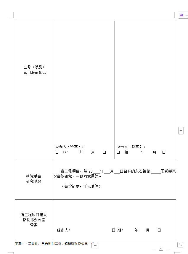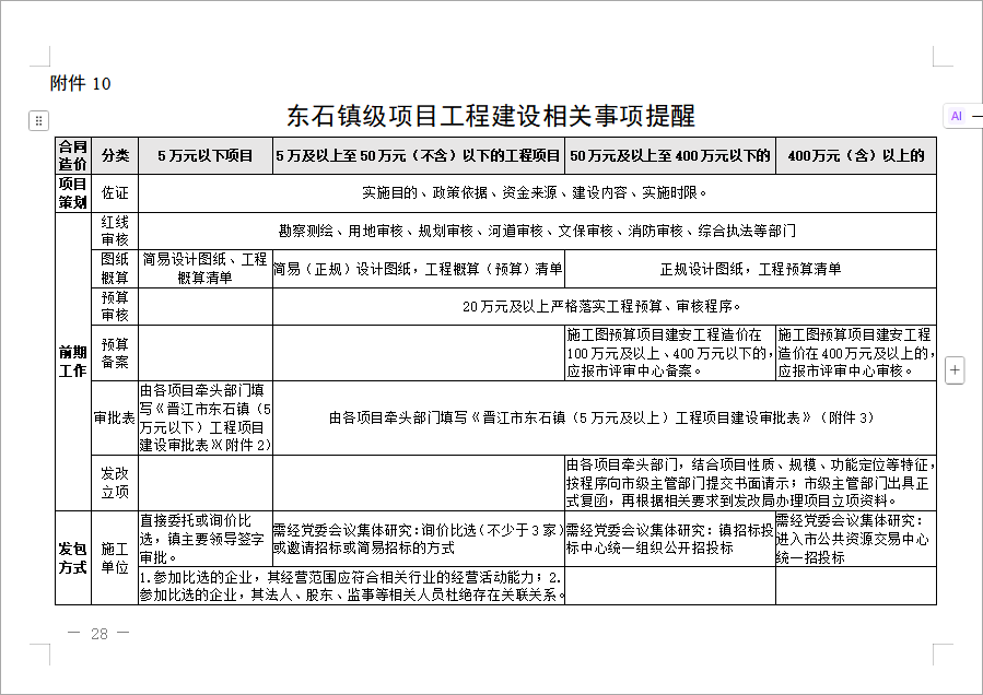 (4)400万元(含)以上的。由各项目牵头部门填写《晋江市东石镇5万元及以上工程项目建设审批表》(附件3),落实资金来源后,经项目牵头部门负责人、分管领导审核后,其发包方式需经党委会议研究(参考附件4)同意后方可实施。应按规定进入市公共资源交易中心进行招投标。