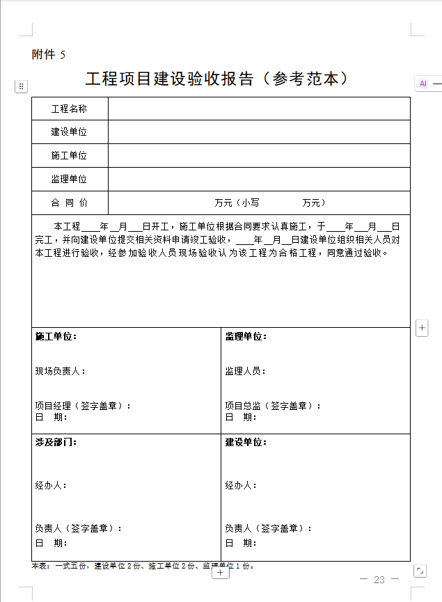 (一)落实竣工验收制度。工程建设完工,施工单位完工后,向责任部门提交验收申请。项目牵头部门要组织相关部门、参建单位进行竣工验收,各参加单位验收人员共同确认,并填写《晋江市东石镇工程项目建设竣工验收报告单》(附件5)。
