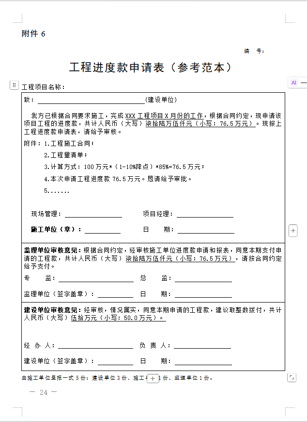 (二)施工单位提交工程量清单、进度款申请表(附件6)、支付凭证(附件7)、开具税票等资料,经监理单位核定,项目责任部门审核。