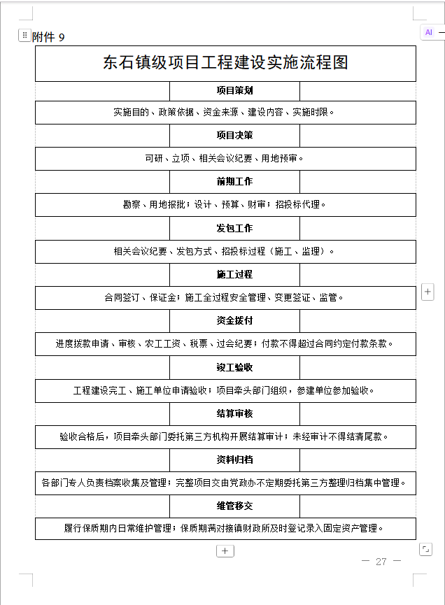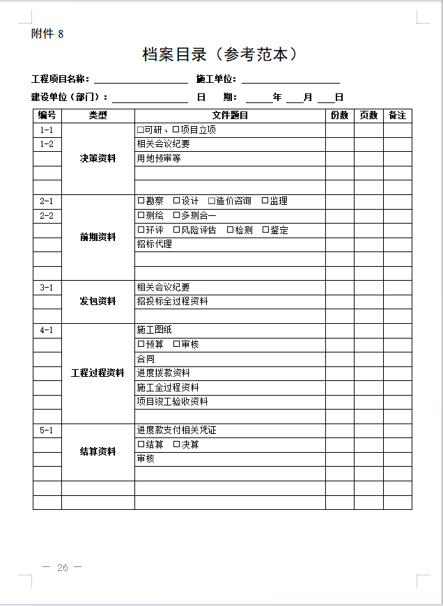 (三)项目建设档案管理。镇(直)办各部门,专人负责档案收集及管理,完整的项目与党政办对接,不定期委托第三方整理归档集中管理;一是分别自行建立工程项目建设汇总清单(目录);二是项目牵头部门需及时建立各工程项目建设全流程完整档案并留存,确保一项目一档案。同时,应备份一份交由镇招投标中心。(档案目录清单资料,参考附件7)