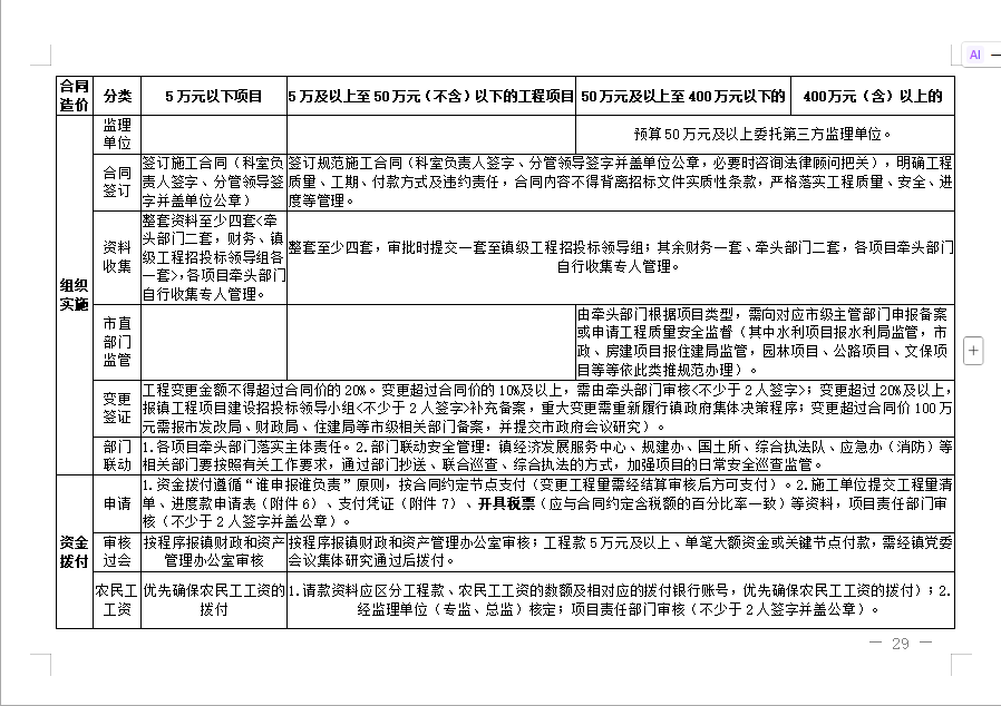 2.落实现场监督管理:(1)项目牵头部门,严格落实质量、安全、进度等管理;项目实施分管领导应当定期召开项目建设调度工作会议,及时协调解决有关问题,有效快速地推动工程项目的建设。(2)50万元及以上项目必须委托监理单位,督促监理单位认真履职,由责任主体部门开展日常巡查;(3)对隐蔽工程验收制度,由责任部门(建设、施工、监理等部门)共同确认;(4)工程变更应按程序报批,变更金额原则上不得超过合同价的20%(其中变更超过合同价的10%及以上,需由牵头部门审核;重大变更超过合同价的20%或者5万元以上,需由牵头部门审核后,报镇工程项目建设招投标领导小组补充备案,需重新报镇党委会集体研究。