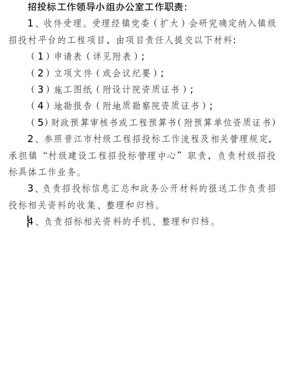 1.统一受理镇、村建设项目招投标的申请,协助指导项目业主制定招标文书;