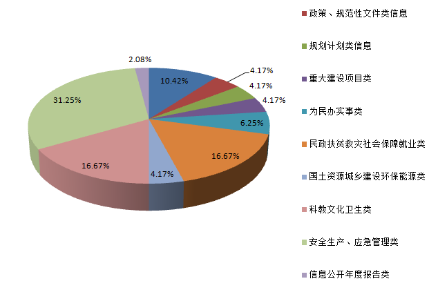 2018年主动公开政府信息的类别主要包括:机构职能类5条,占10.42%;政策、规范性文件类2条,占4.17%;规划计划类2条,占4.17%;重大建设项目类2条,占4.17%;为民办实事类3条,占6.25%;民政扶贫救灾社会保障就业类8条,占16.67%;国土资源城乡建设环保能源类2条,占4.17%;科教文化卫生类8条,占16.67%;安全生产、应急管理类15条,占31.25%。;信息公开年度报告类1条,为2017年政府信息公开工作年度报告,占2.08%。
