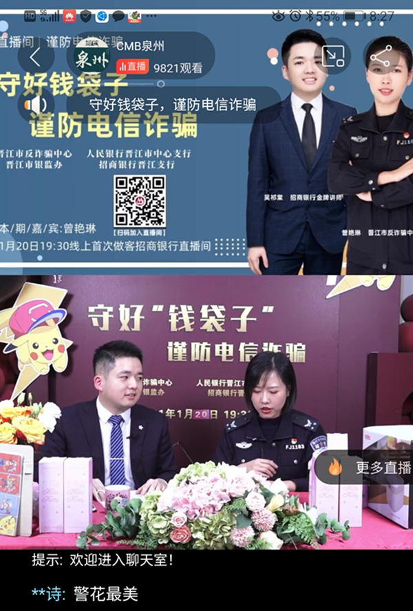 为进一步深化“百日千警进万家”集中宣传活动,丰富防骗宣传载体,提升宣传成效,1月20日晚,晋江市公安局联合晋江市银保监管组、人民银行晋江市中心支行、招商银行晋江支行,对晋江市青阳、梅岭、西园、池店、安海五个镇街涉及的16所学校的师生、家长,开展“守好钱袋子 谨防电信诈骗”防骗直播活动 。
