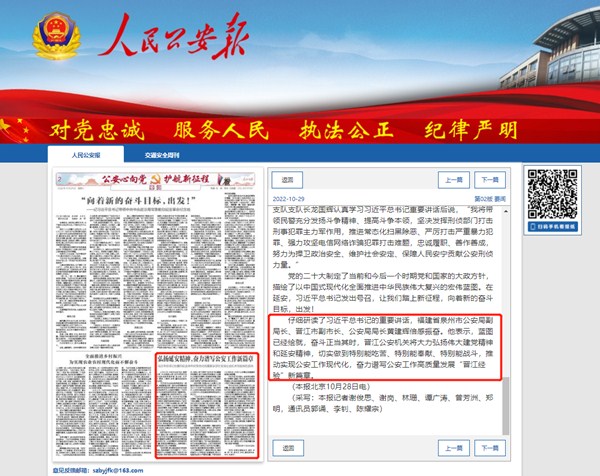 期中,报道了泉州市局副局长、晋江市副市长、公安局长黄建辉的学习心得:仔细研读了习近平总书记的重要讲话,我倍感振奋。蓝图已经绘就,奋斗正当其时,晋江公安机关将大力弘扬伟大建党精神和延安精神,切实做到特别能吃苦、特别能奉献、特别能战斗,推动实现公安工作现代化,奋力谱写公安工作高质量发展“晋江经验”新篇章。