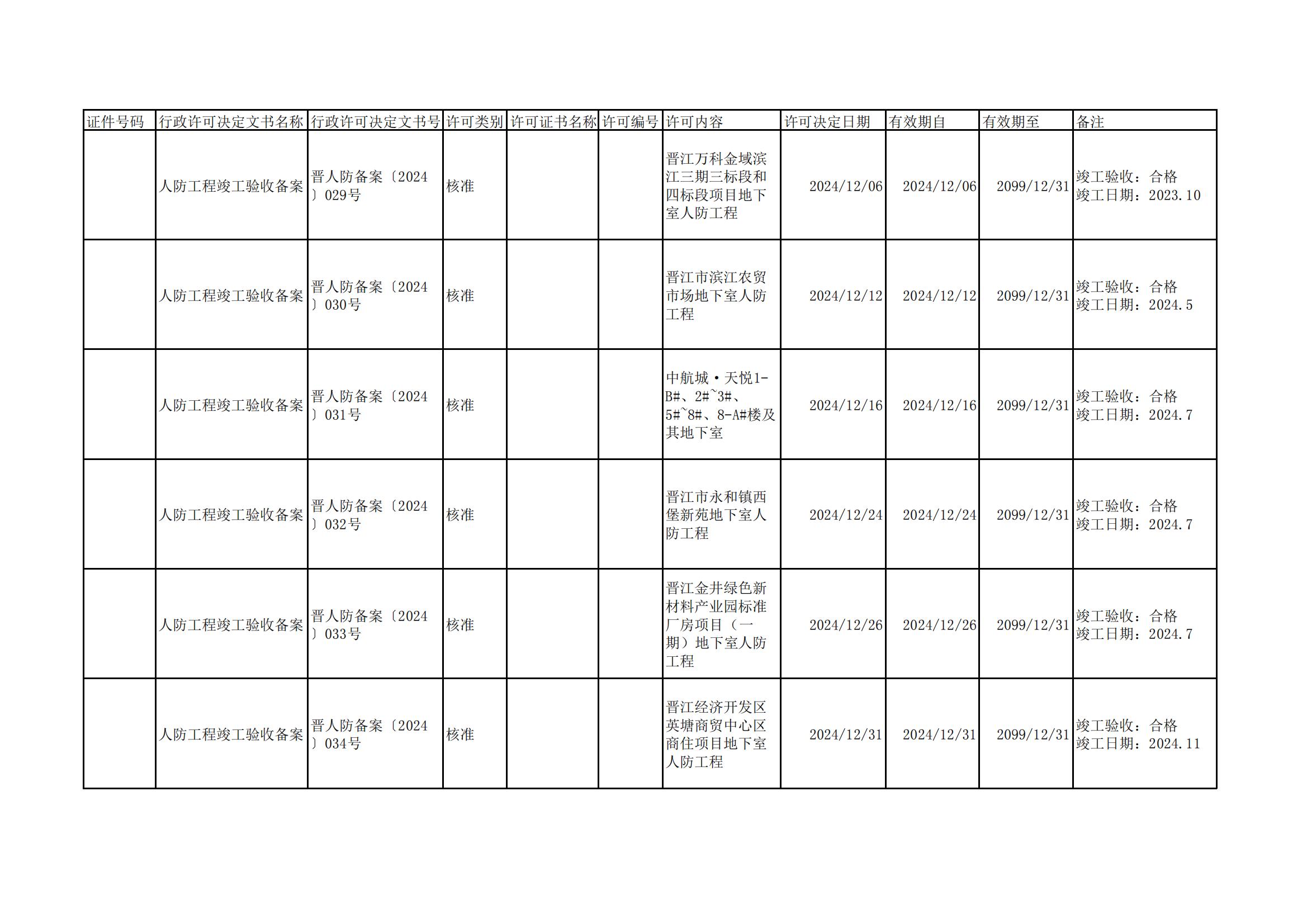 晋江人防2024年12月竣工备案信息公示