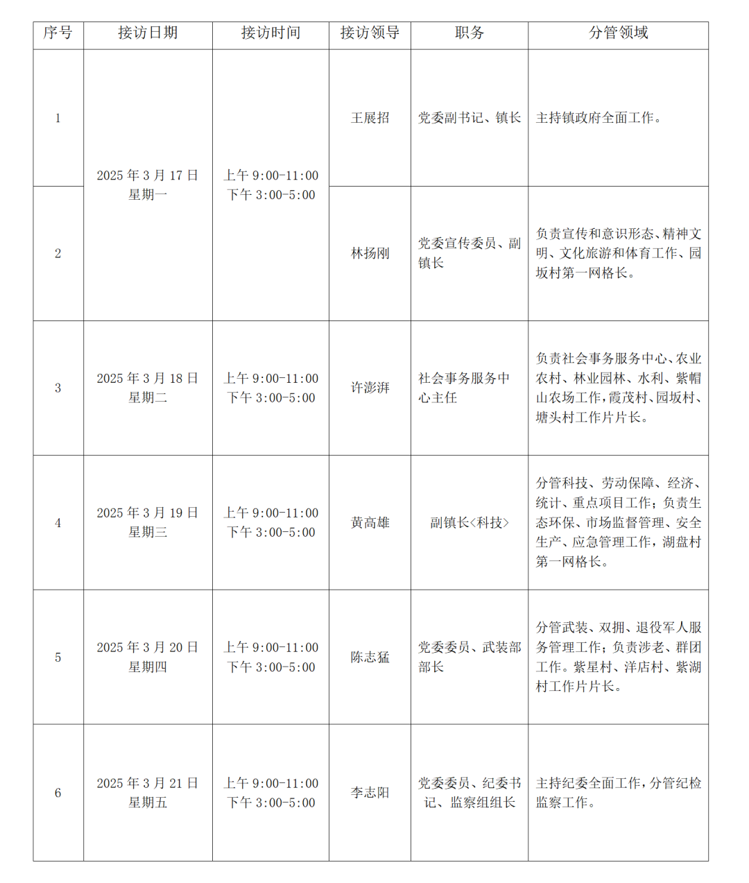 倾听心声,服务百姓。为深入了解民意诉求,急解群众急难愁盼,扎实推进紫帽镇信访法治化工作,切实为群众排忧解难,紫帽镇开展领导干部公开接待群众活动,现将2025年3月17日至2025年3月21日领导干部公开接访信息公告如下: