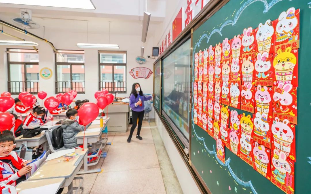 开学当天,不少学生提着灯笼入学,并将灯笼悬挂在教学楼走廊上,增添了传统节日的氛围。学校还为获得“手工创意灯笼”评选奖项的同学颁奖。在小主持人的带领下,所有学子共同喊出了新学期的目标,并齐跳《兔子手势舞》。