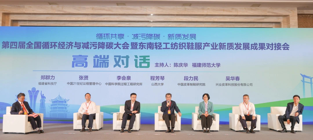 中国科学院过程研究所研究员李会泉,山西大学教授程芳琴,中国皮革制鞋研究院党委书记、总经理段力民,中国科学院过程工程研究所研究员张贤,福建省科技厅社发处处长郑群力,兴业皮革科技股份有限公司董事长吴华春等6位代表围绕“循环经济如何赋能产业发展”进行了高端对话。