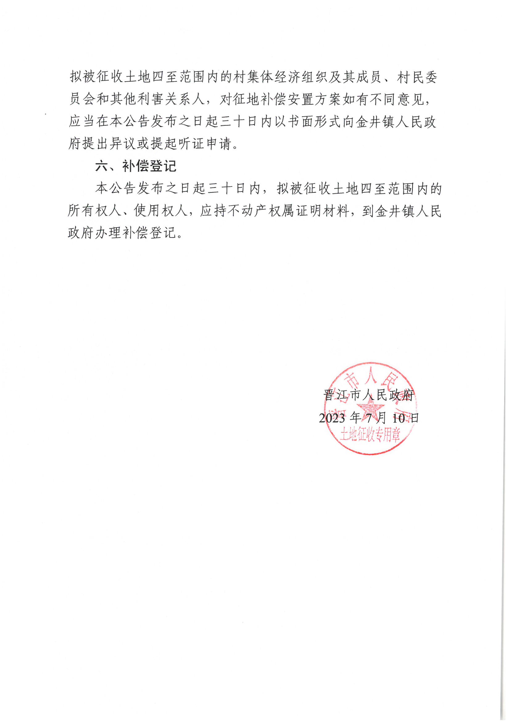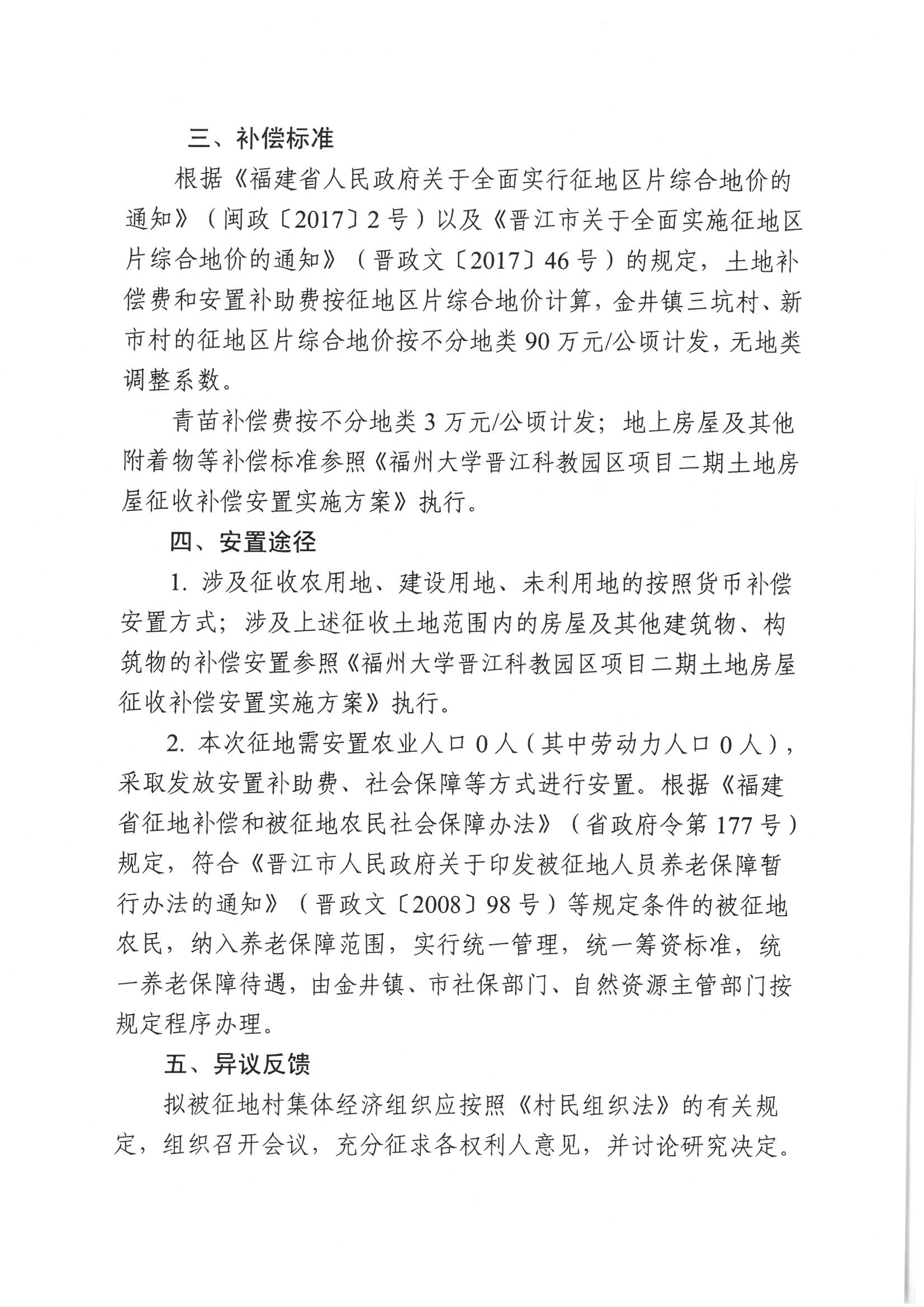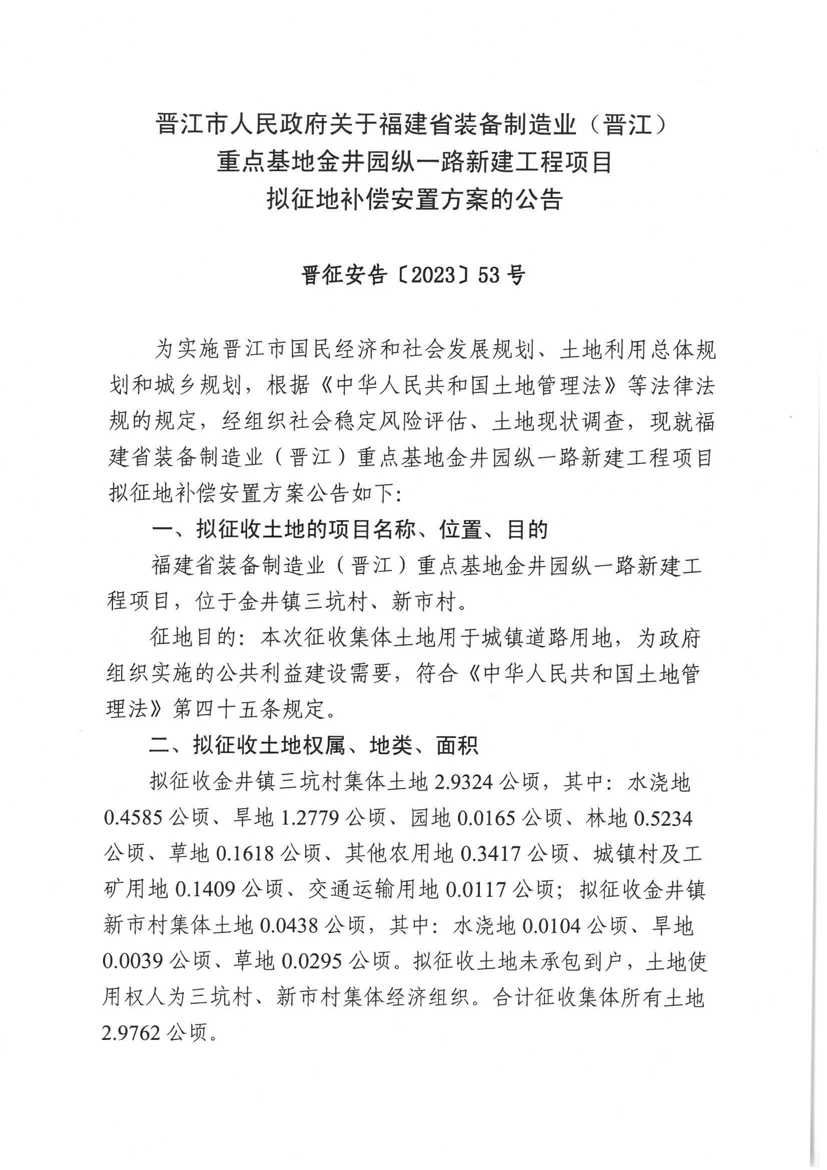 晋江市人民政府关于福建省装备制造业(晋江)重点基地金井园纵一路新建工程项目拟征地补偿安置方案的公告