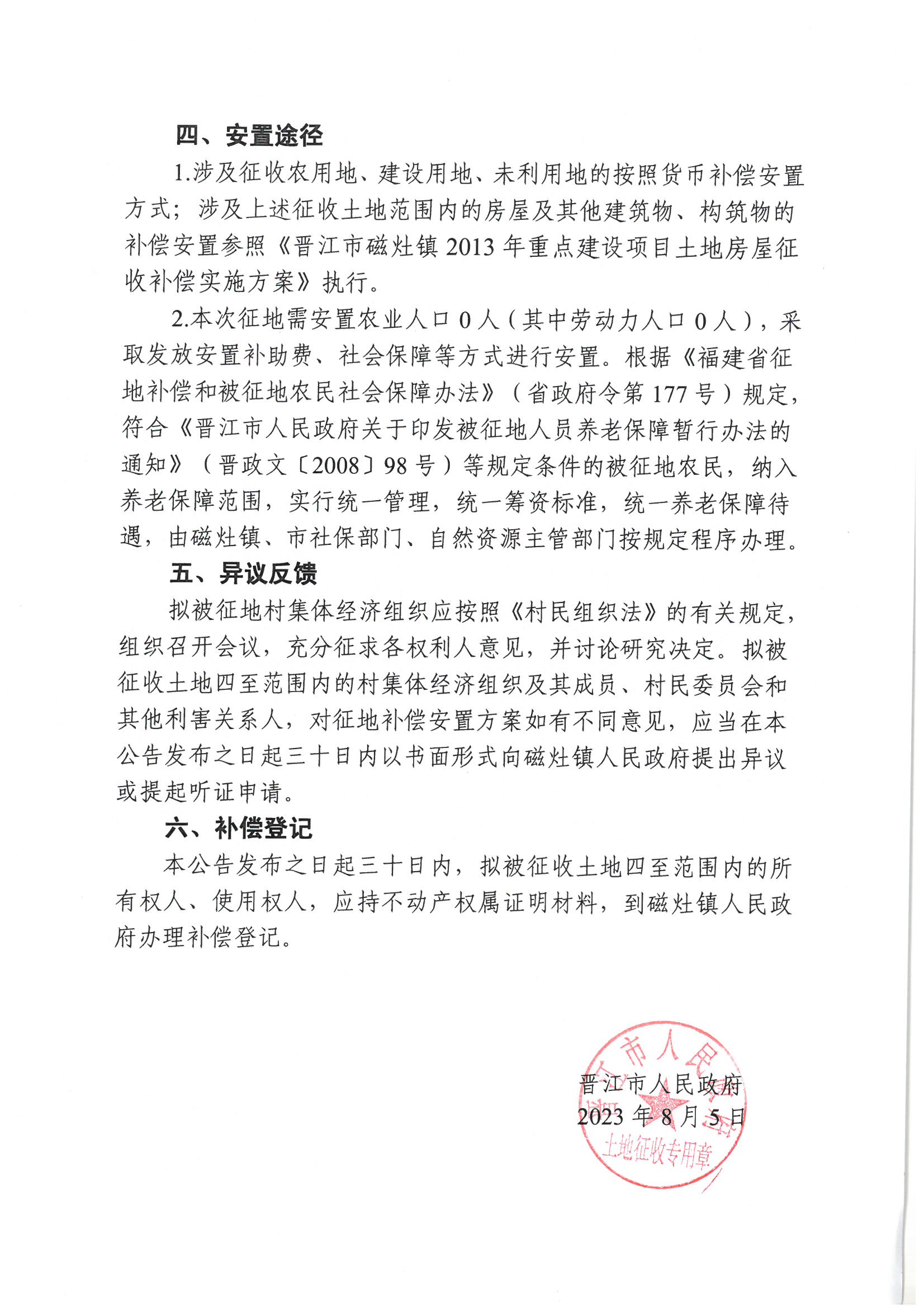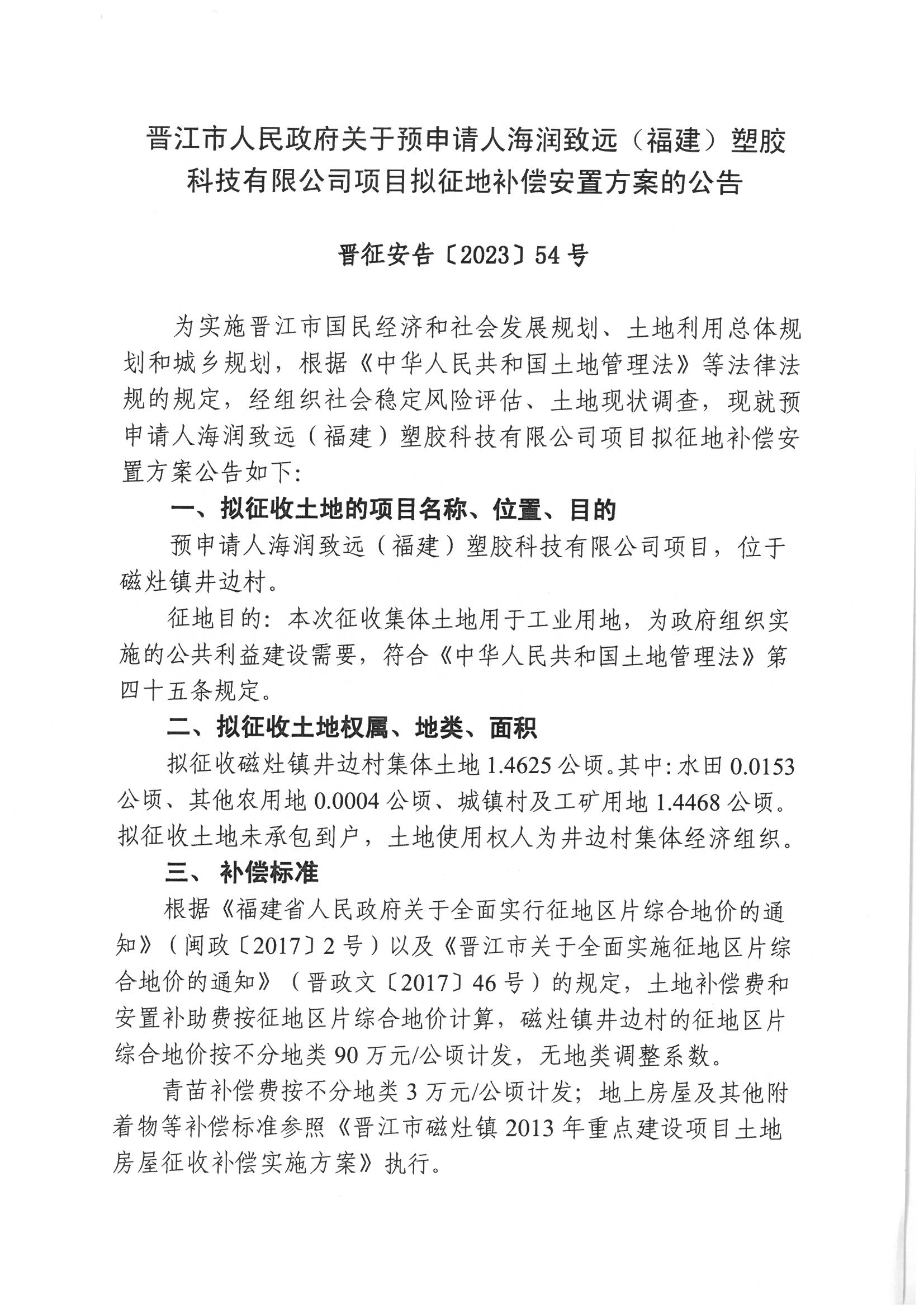 晋江市人民政府关于预申请人海润致远(福建)塑胶科技有限公司项目拟征地补偿安置方案的公告