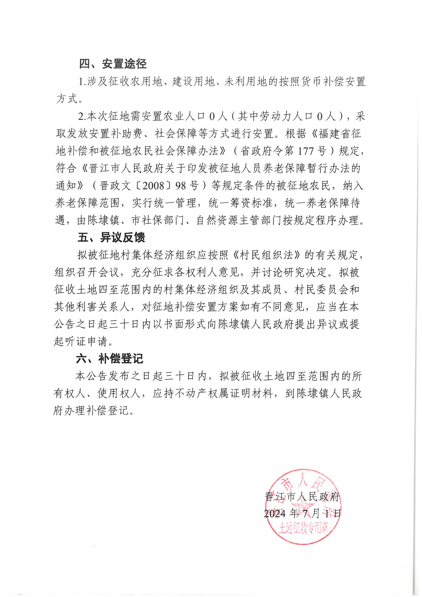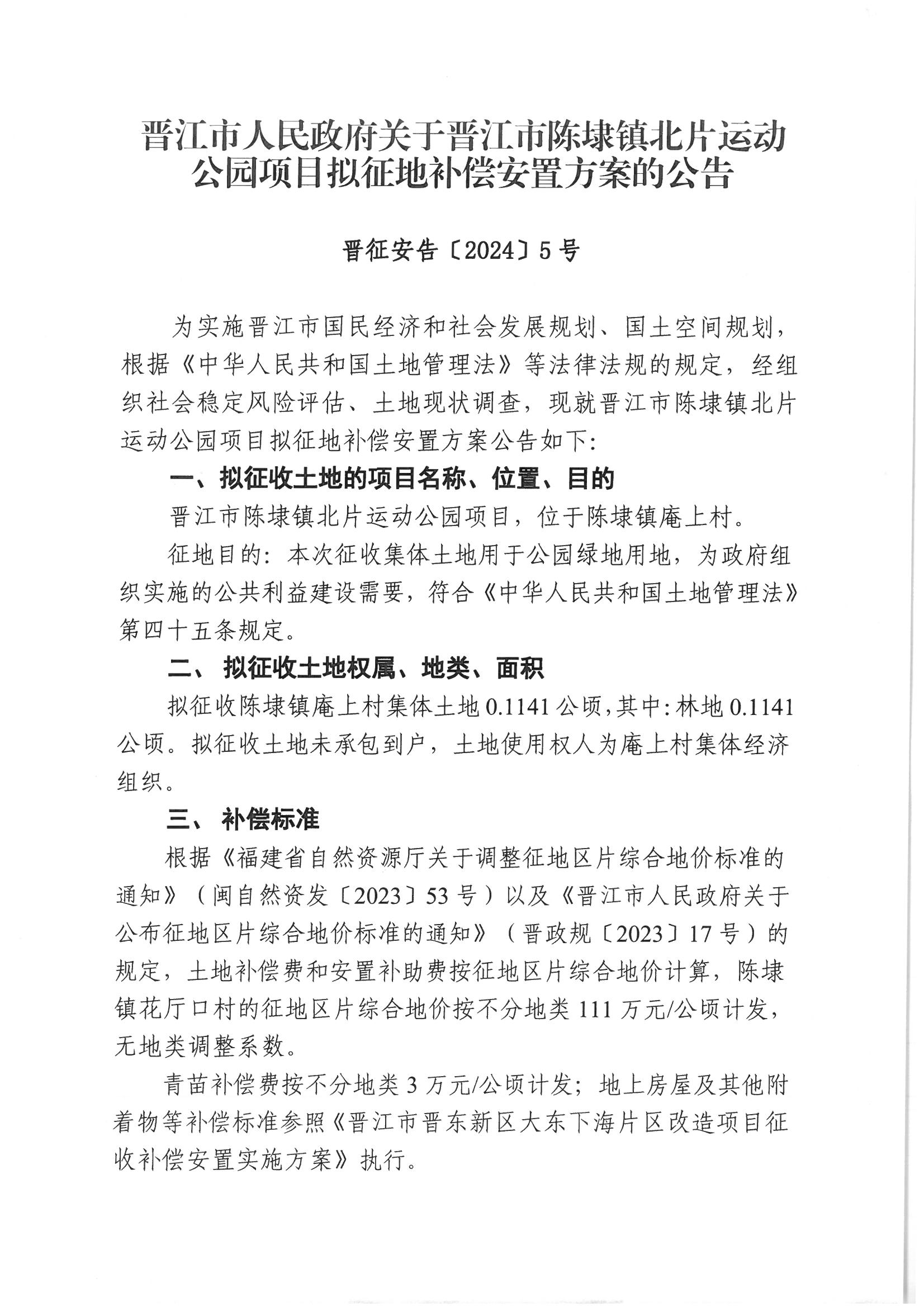 晋江市人民政府关于晋江市陈埭镇北片运动公园项目拟征地补偿安置方案的公告