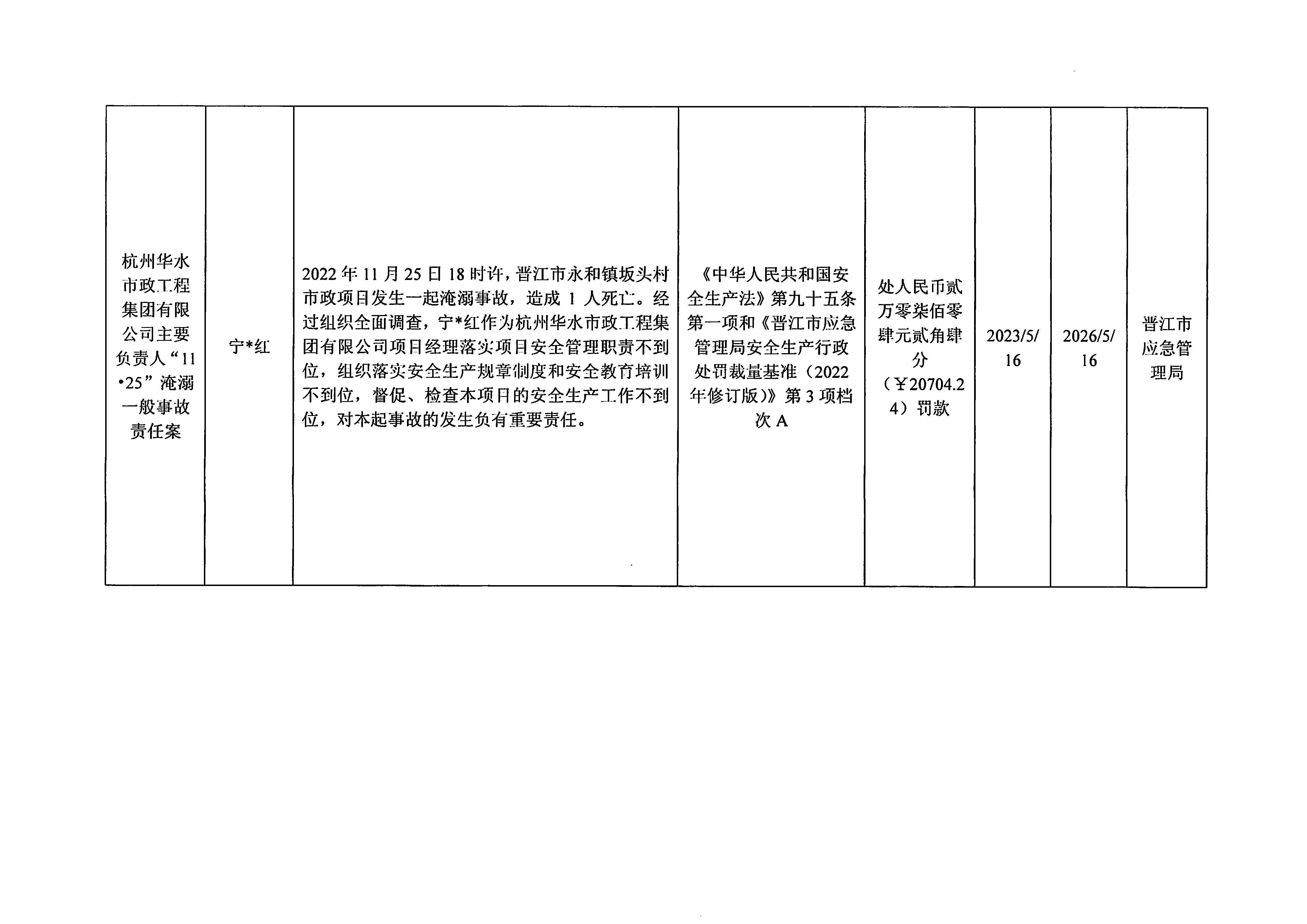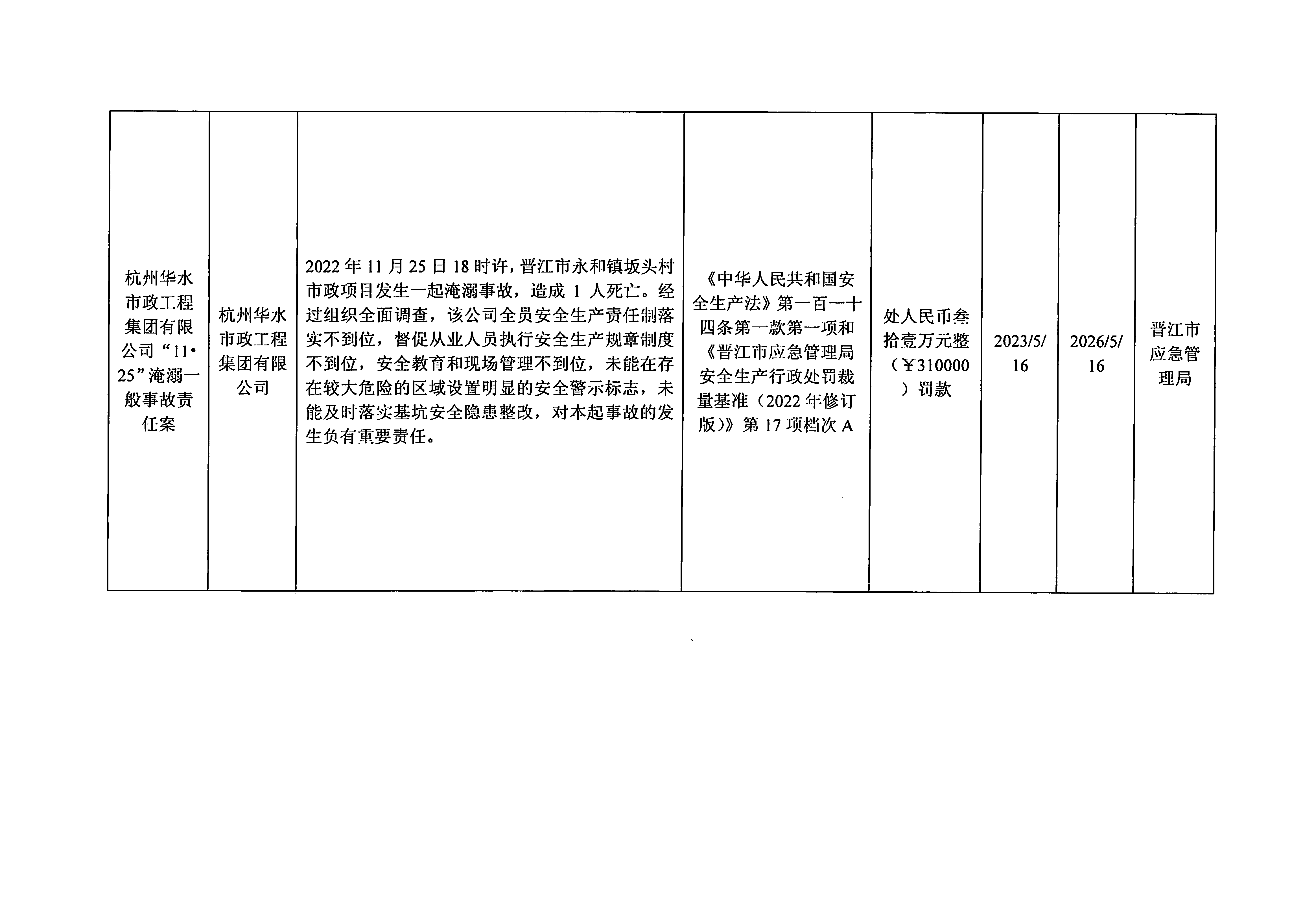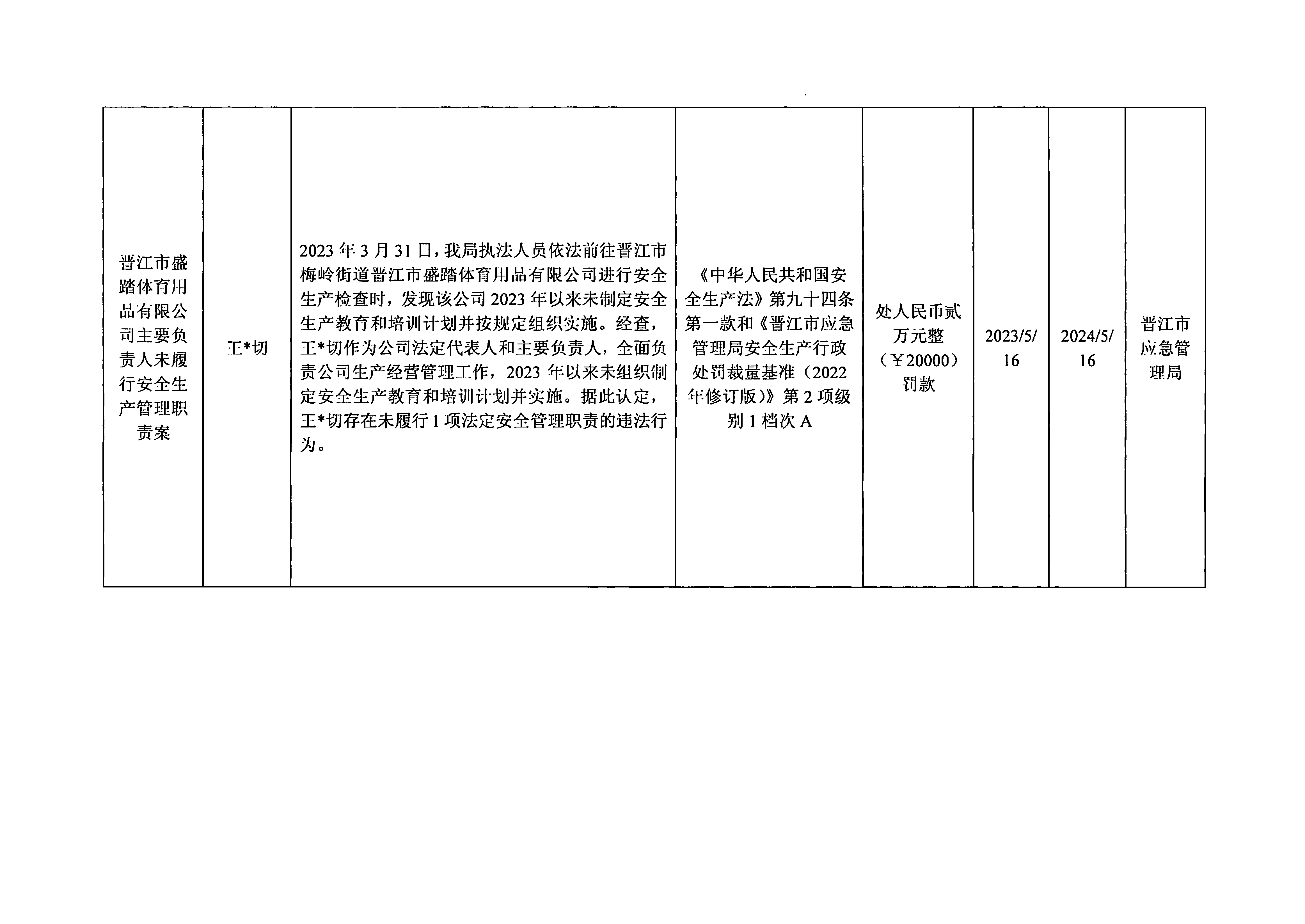 晋江市安全生产领域行政处罚公示表(2023.05.19)