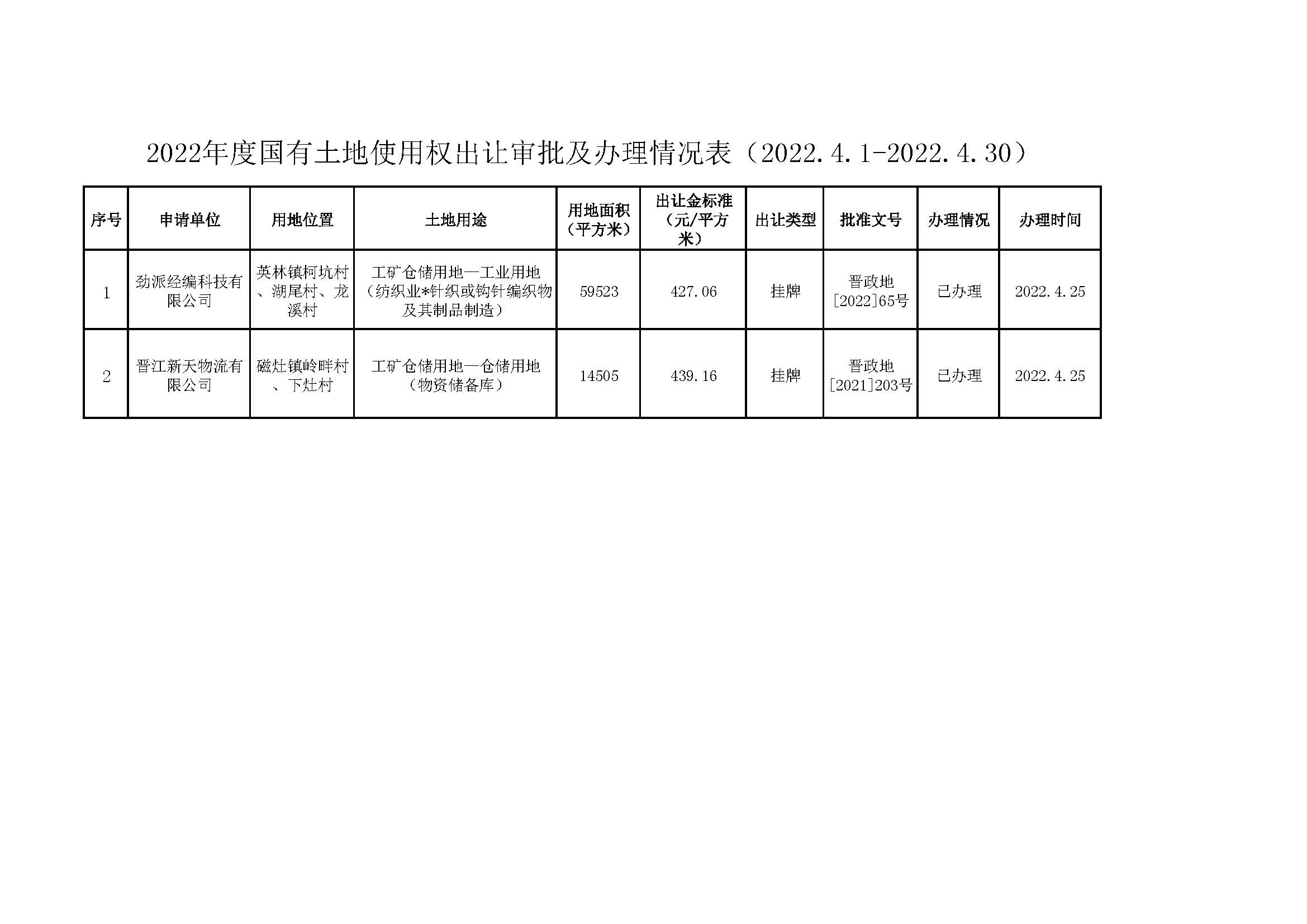 2022年度国有土地使用权出让审批及办理情况表(2022.4.1-2022.4.30)
