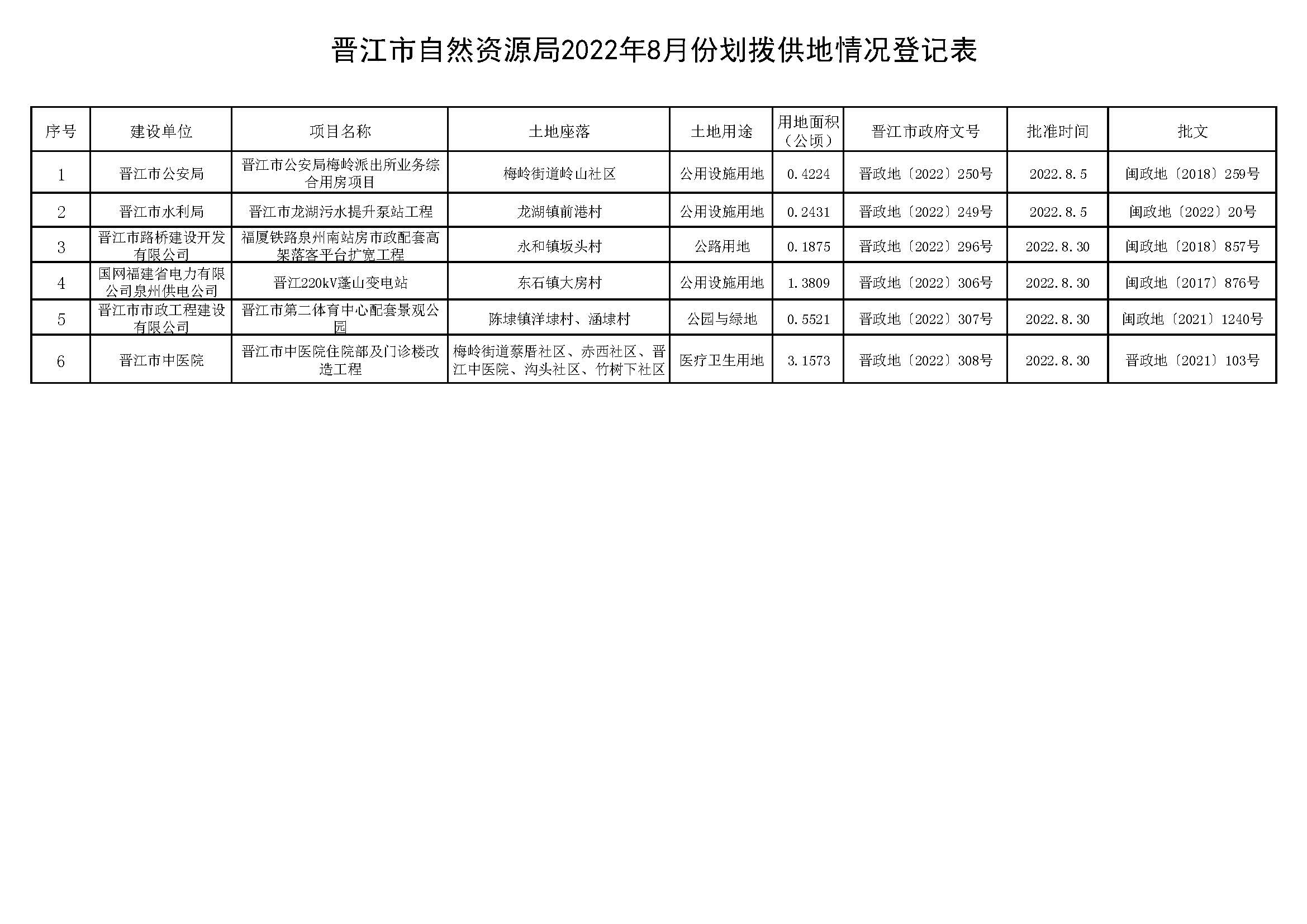 晋江市自然资源局2022年8月份划拨供地情况登记表