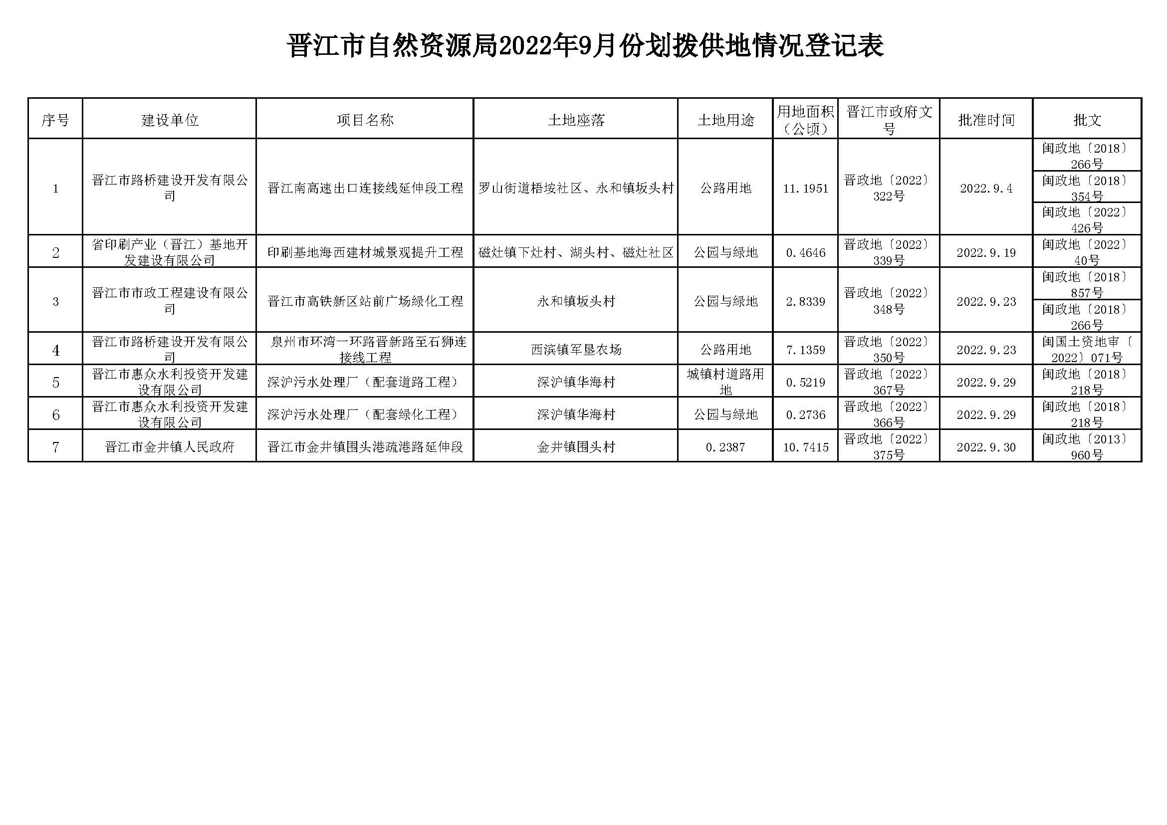 晋江市自然资源局2022年9月份划拨供地情况登记表