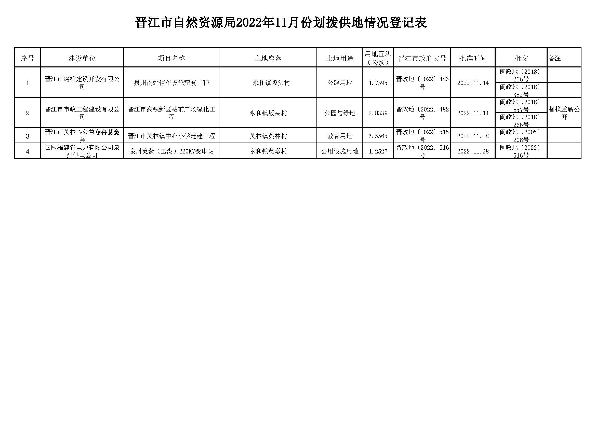 晋江市自然资源局2022年11月份划拨供地情况登记表