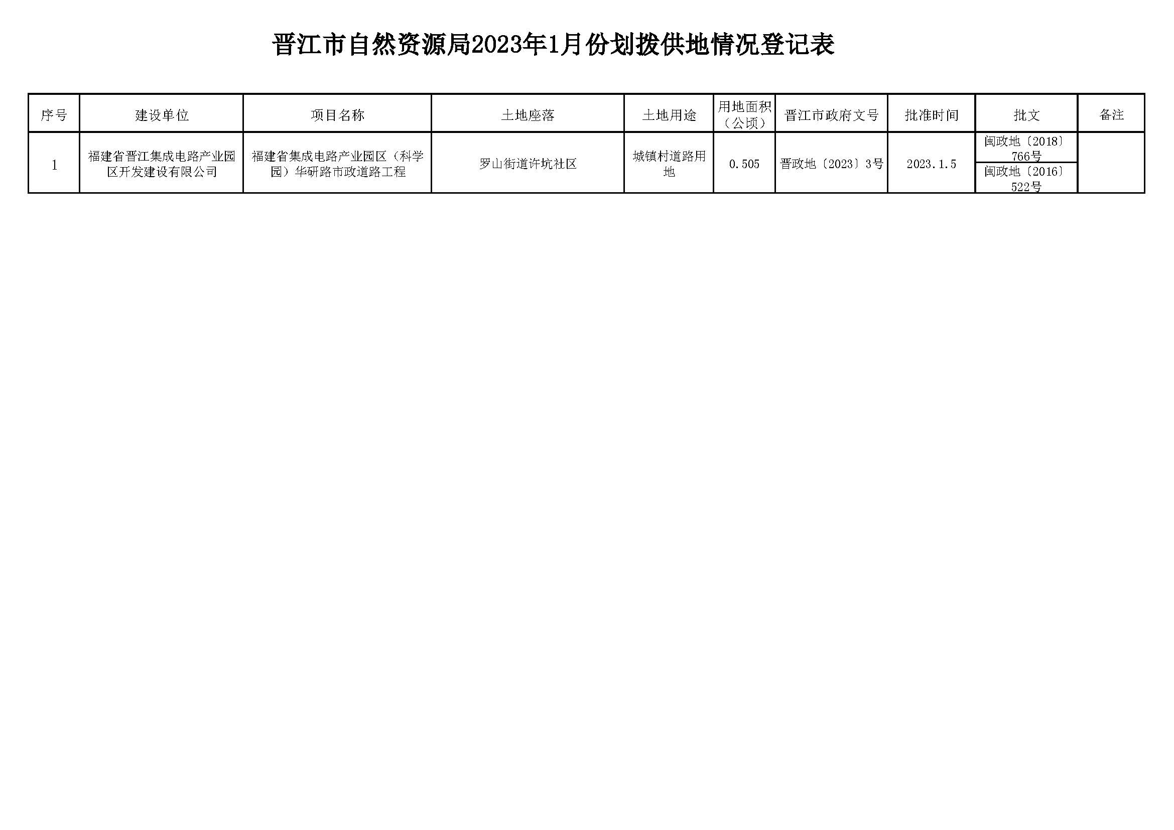 晋江市自然资源局2023年1月份划拨供地情况登记表
