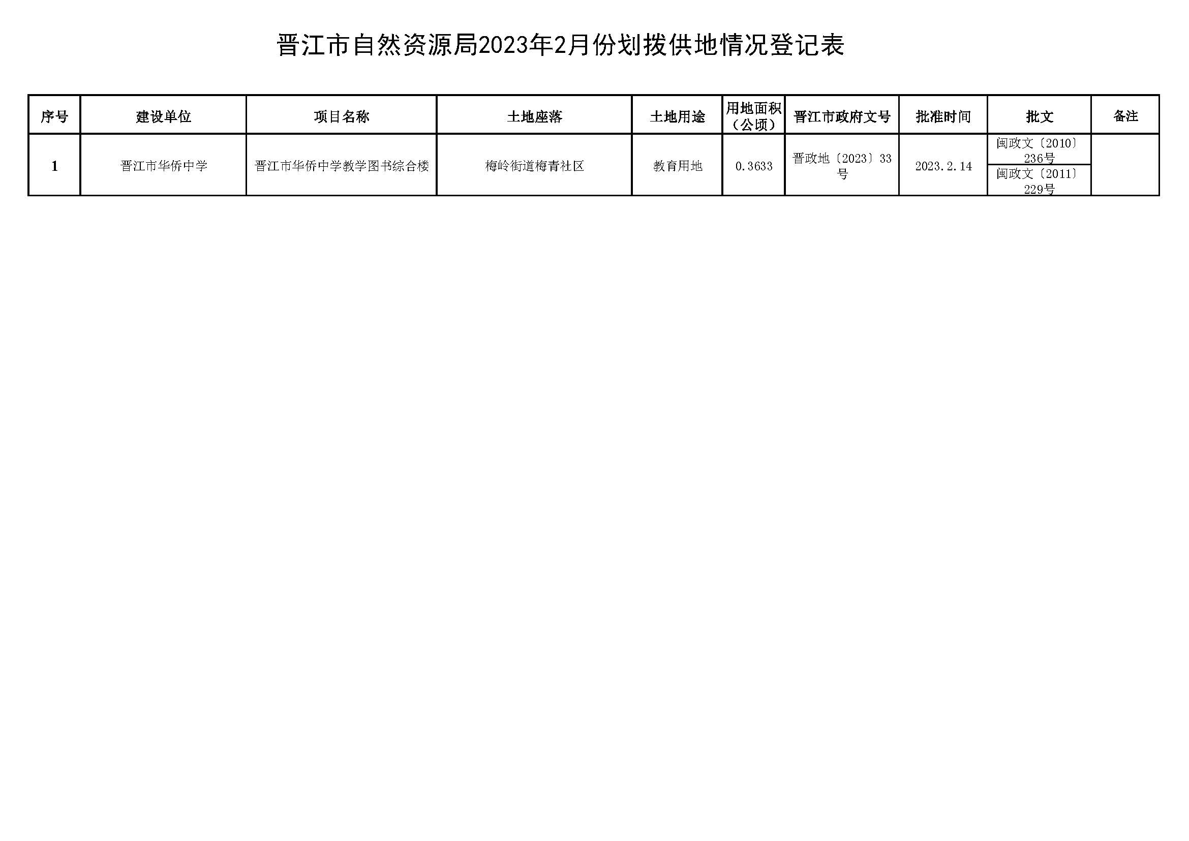 晋江市自然资源局2023年2月份划拨供地情况登记表