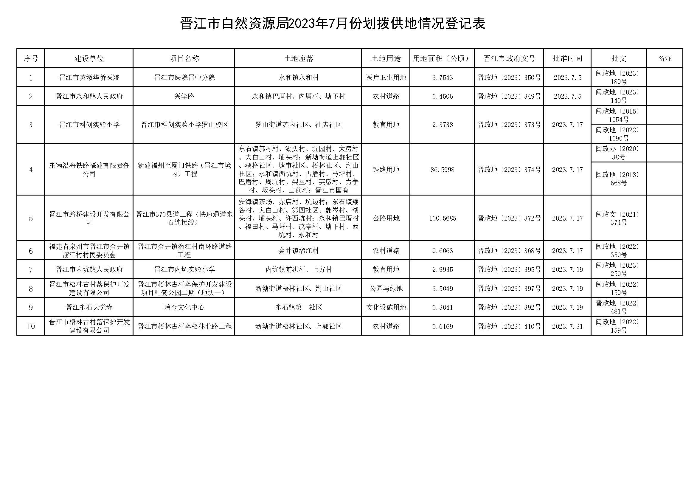 晋江市自然资源局2023年7月份划拨供地情况登记表
